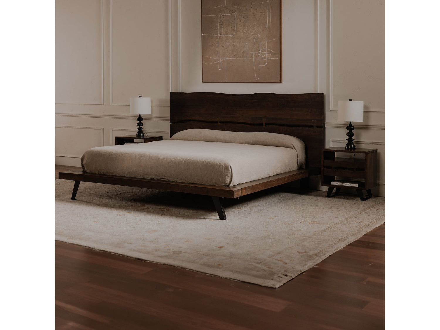 - Solid Acacia wood frame with angular, powder-coated steel legs. Organic edge headboard with butterfly joinery
