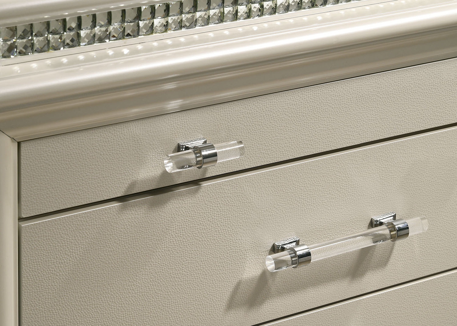 Create a room made for a princess with this bedroom set from the Maddie Collection. The curved headboard is padded and upholstered in a horizontally-tufted leatherette, emphasizing the pearl white finish. The dresser and chest feature acrylic legs, crystal accents, and a beveled mirror with a LED light creating a glamorous aesthetic. Give into your glitzy side with this opulent set.