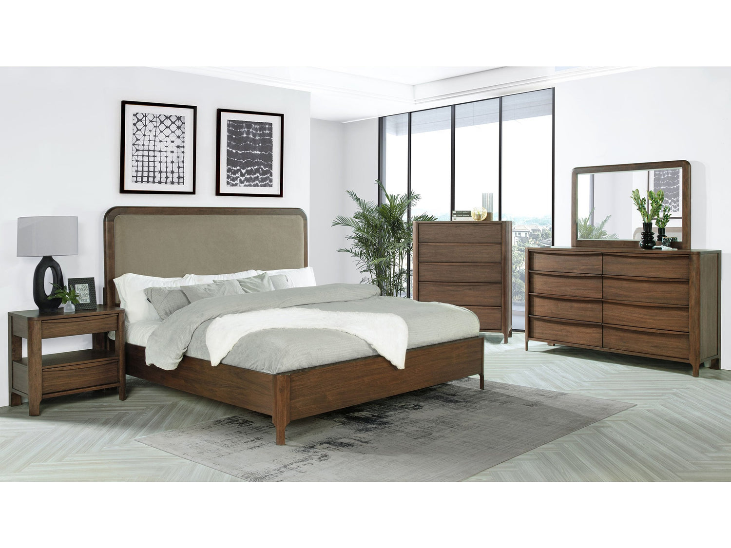 - Includes: One (1) queen bed, one (1) nightstand, one (1) dresser, one (1) dresser mirror, and one (1) chest- A modern bedroom set focuses on simplicity with clean lines and a rich, warm walnut wood finish
