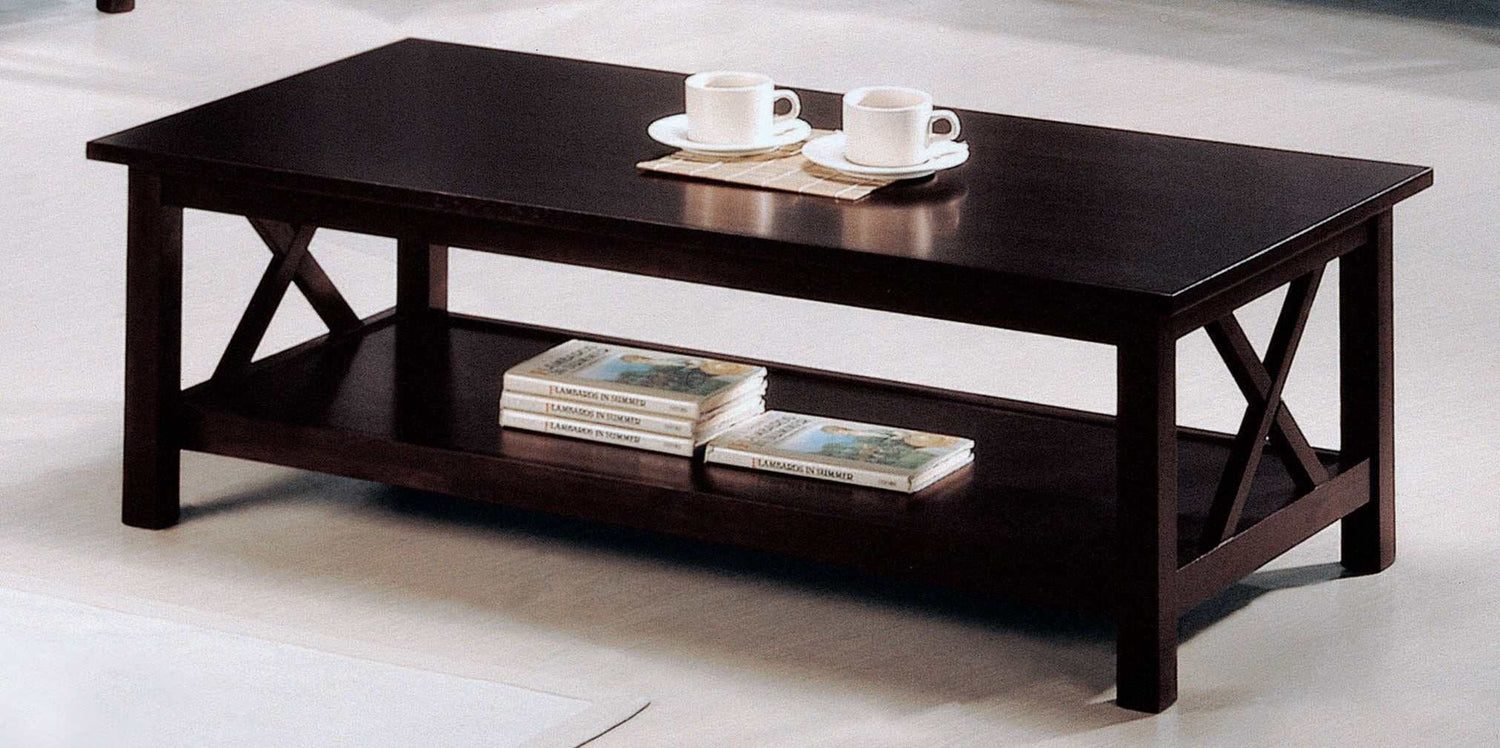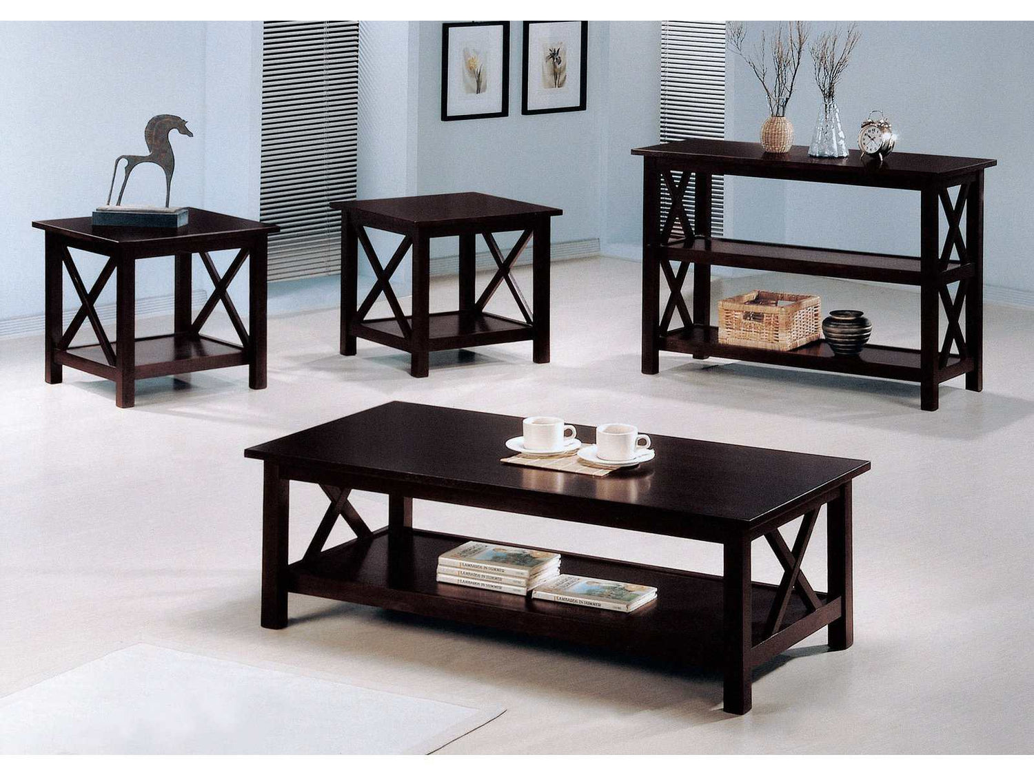 Transcending modern and traditional motifs, this three-piece set of occasional tables is an excellent choice for a transitional space. Stylish linear silhouettes feature an x-style frame on the end of each table. Finished in a deep merlot, it offers a gorgeous, bold look. Embellish a seating group with this set of a coffee table and matching end tables. Each offers storage and display on a lower shelf.