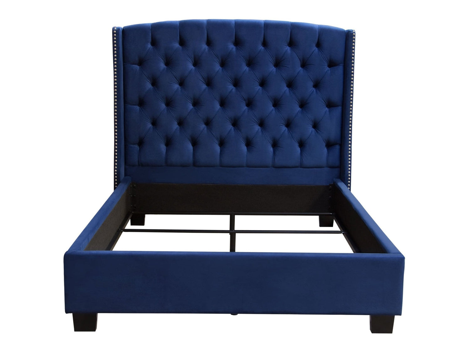 - With its tufted headboard, vintage wings with pewter nail head accents and wood feet finished in a rich medium walnut finish providing the backdrop for the Royal Navy Blue Velvet finish .