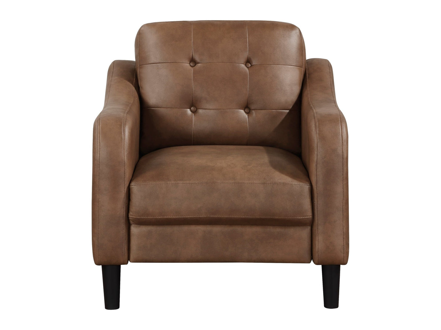 A versatile look for your casual living room comes in the form of the Mallory Collection. The button tufted seat back and contoured arms lend traditional accent to this transitional chair, with brown polished microfiber upholstery furthering the decorative versatility of the piece.