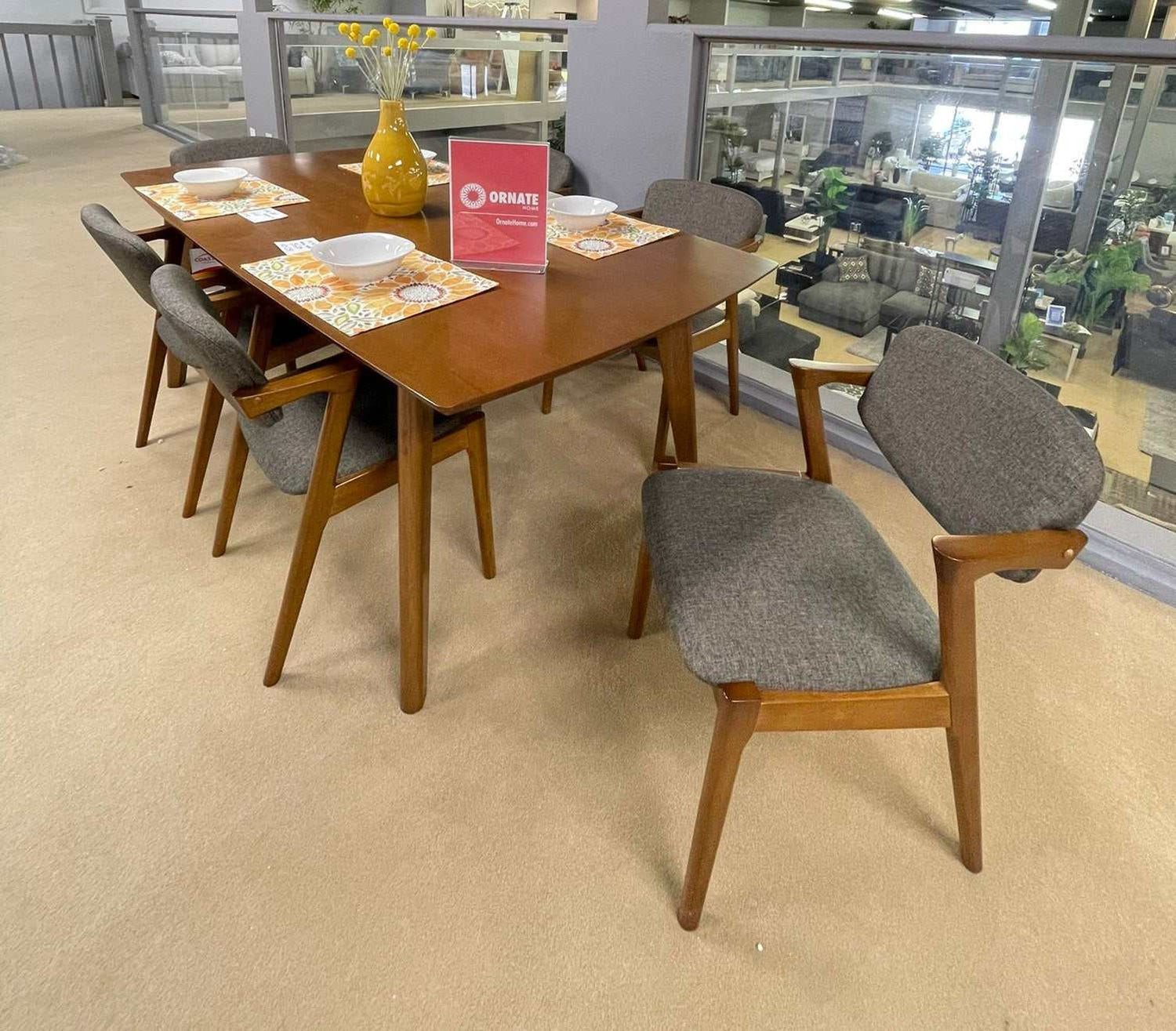 - Rectangular table crafted from Asian hardwood in a dark walnut finish seats 6 comfortably