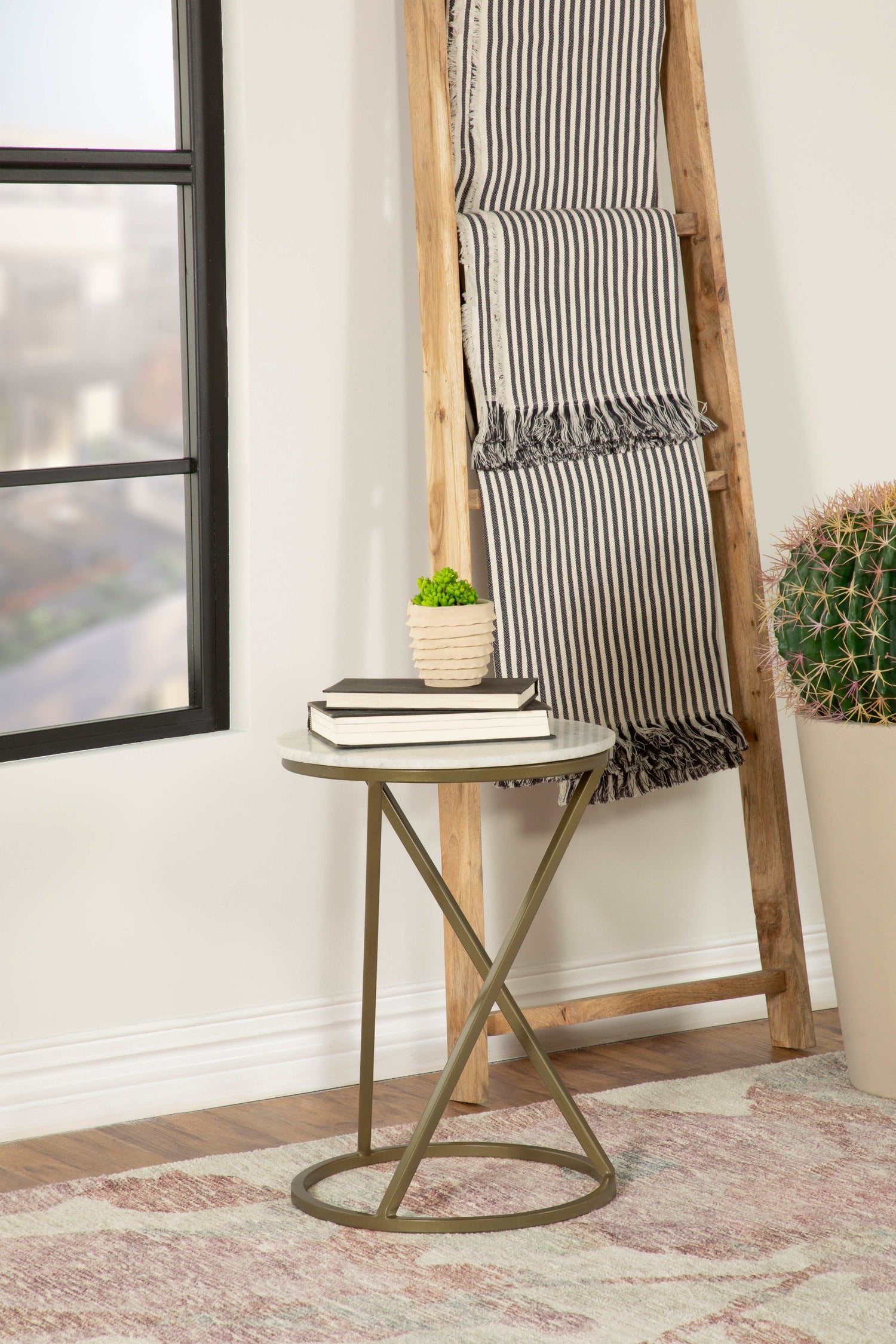 Topped with a solid white marble, this contemporary accent table offers up classical elements with modern silhouettes and shapes. situated on a flush ringlet base is a frame with an angled and straight metal support structure. The elegant, eye-catching base also features a warm, antique gold finish that lends a traditional flair. Perfectly suited nestled beside an accent chair or doubling as a Nightstand: in a compact bedroom space, this accent table can support books, refreshments or a potted plant for a hint of greenery. Versatile as it is stylish, this round accent table offers soft lines and an effortlessly understated timeless look.