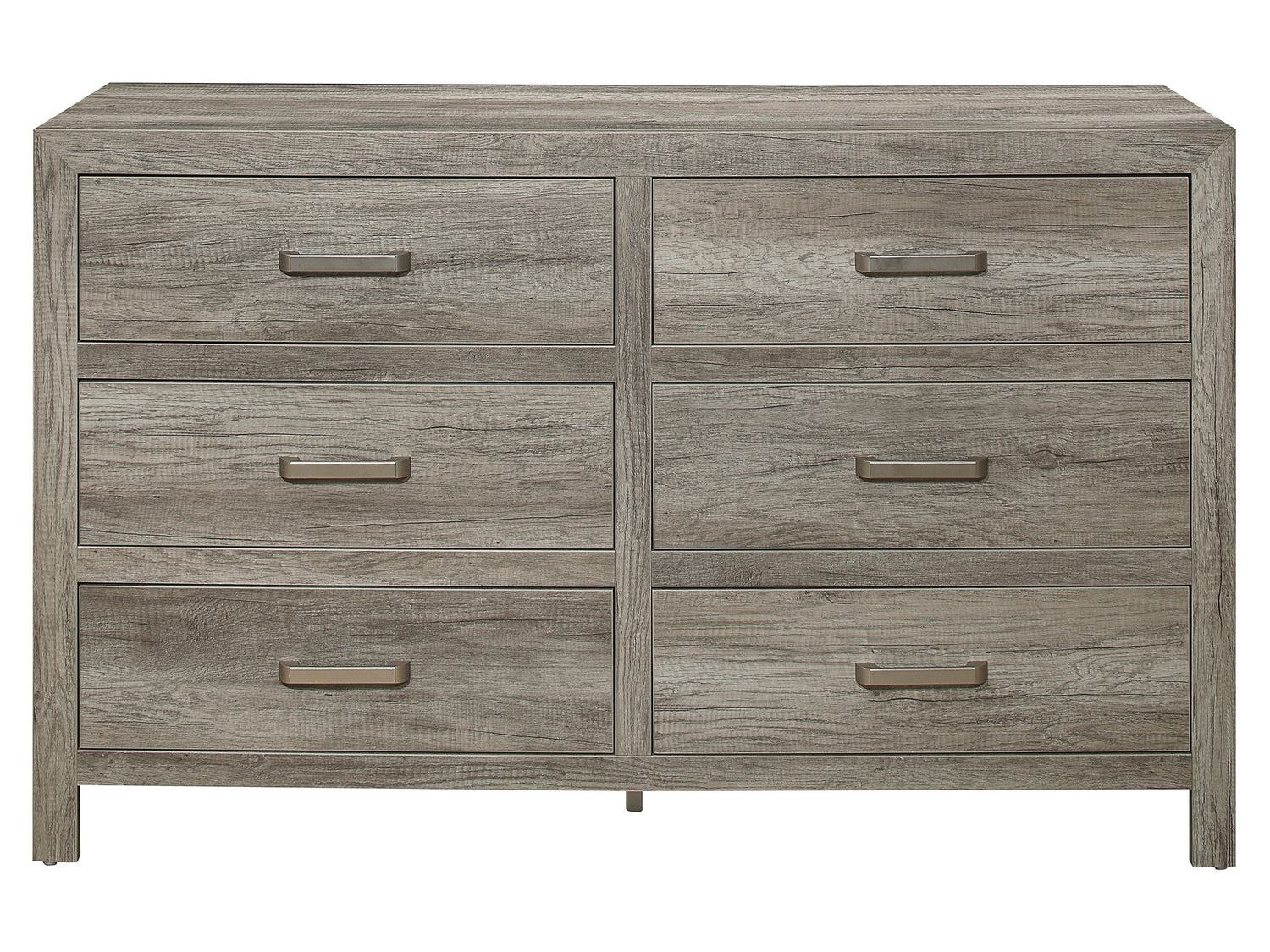 The modern lines of the Mandan Collection are blended with transitional aesthetic to create a unique offering for your bedroom. Utilizing faux wood veneer creates the look of authentic wood planks with the gray finish further lending to the rusticated style. Satin nickel bar hardware fronts each drawer providing contrasting complement to the dresser.