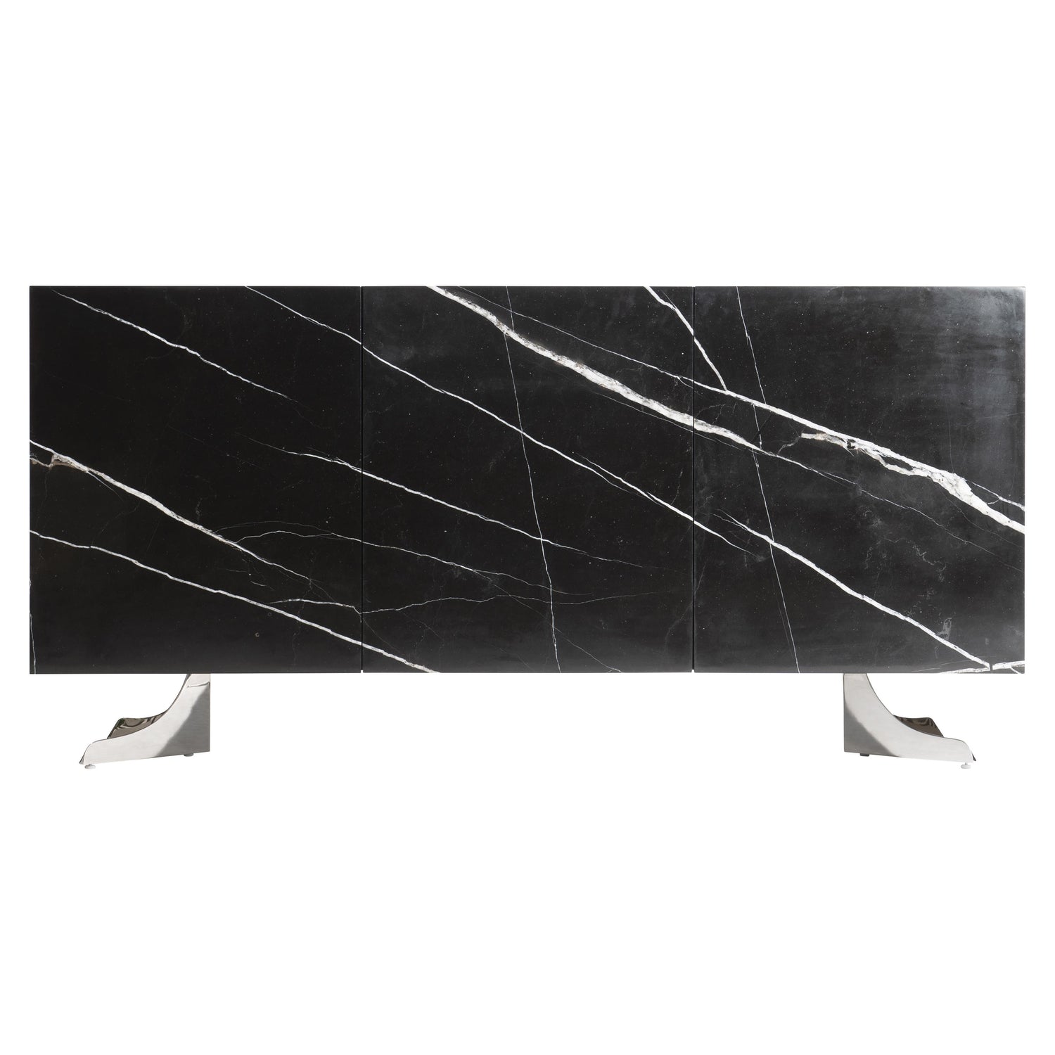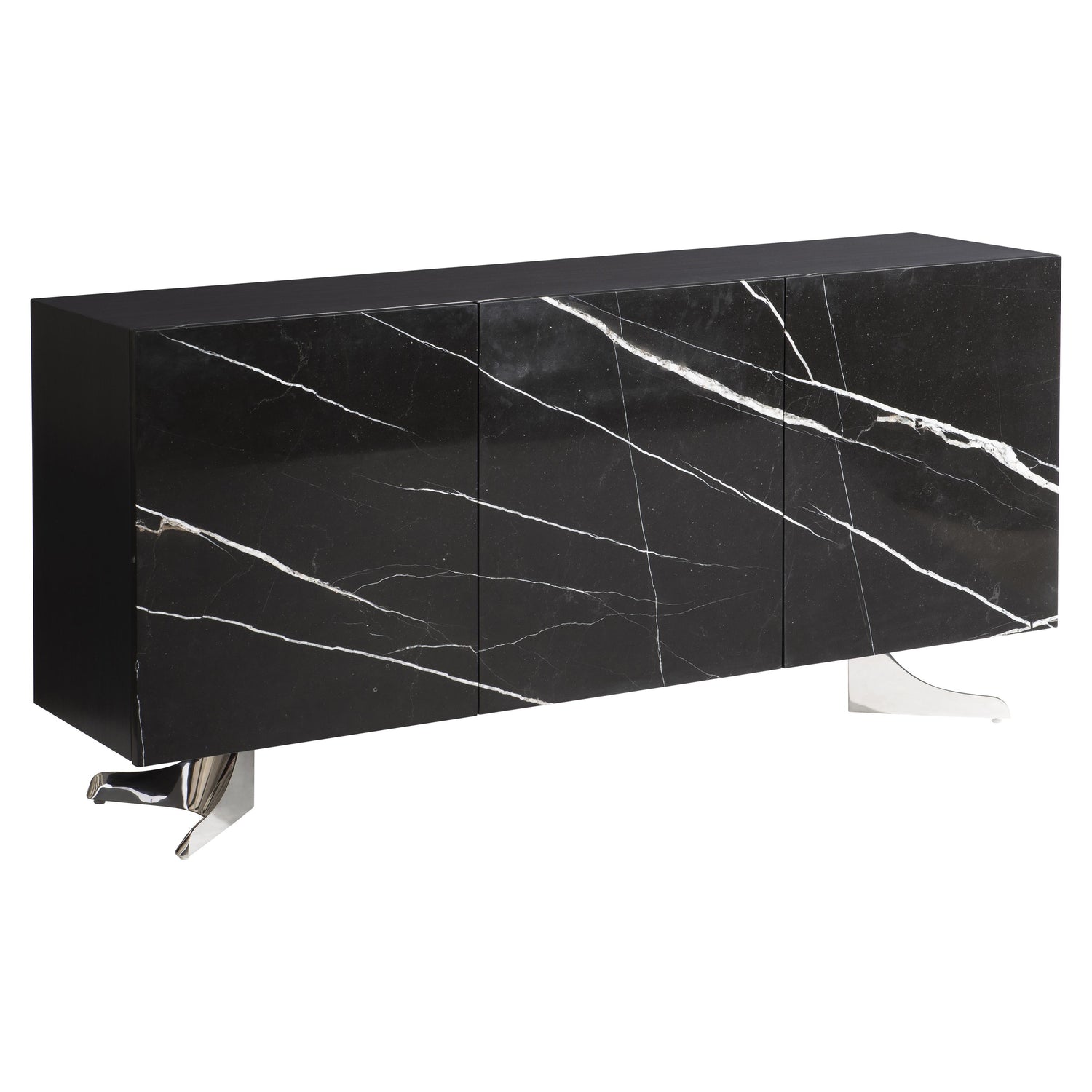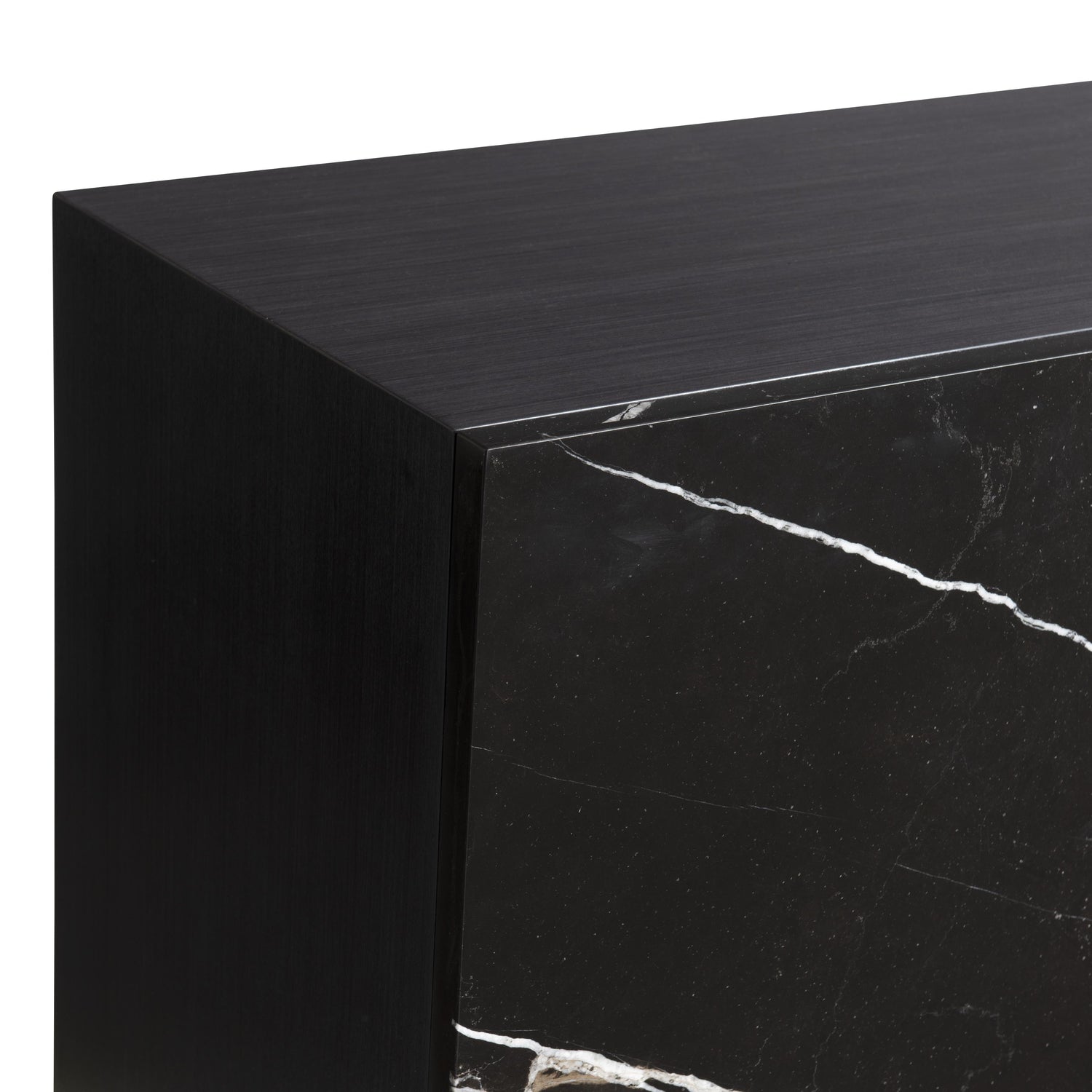 - Nero Marquina laminated stone overlay on fronts and edges of three push-to-open, soft-close doors