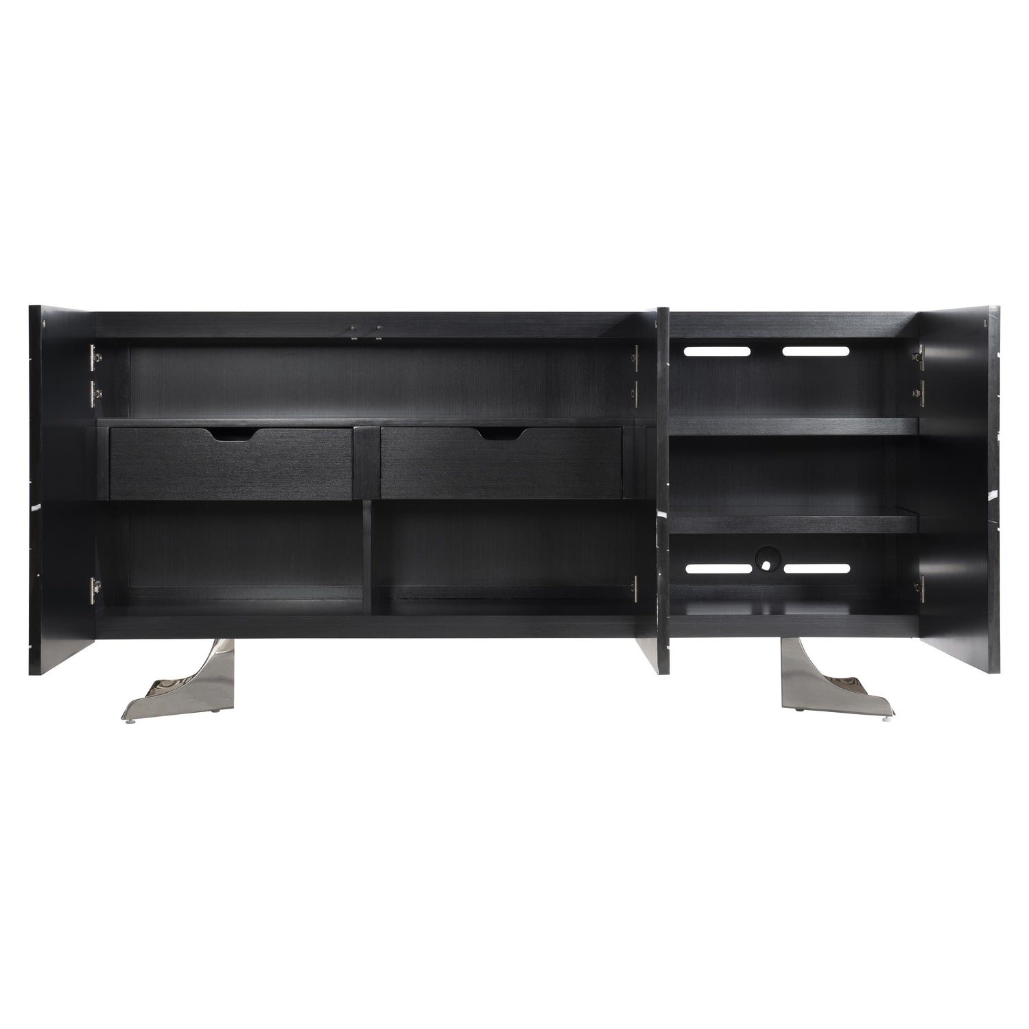 - Behind paired left and center door is a fixed shelf above two soft-close drawers with hand-pull cutout and a black Guardian cloth wrapped pad in the left drawer and a black silverware insert in the right drawer
