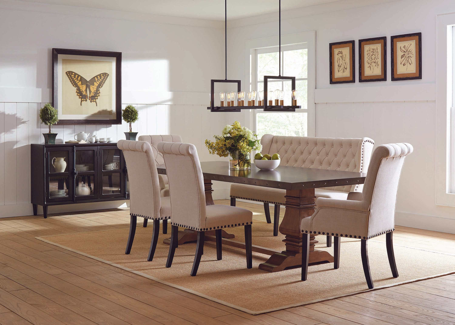 Airy elegance adds a charming touch in a semi-casual space. This dining chair celebrates style with a lovely cream fabric upholstery. Linear design offers an armless profile with tapered legs. A tufted seat back and nailhead trim build its personality with a touch of character. Contrast created by deep finish legs shapes the decor allure of this exceptional dining chair.