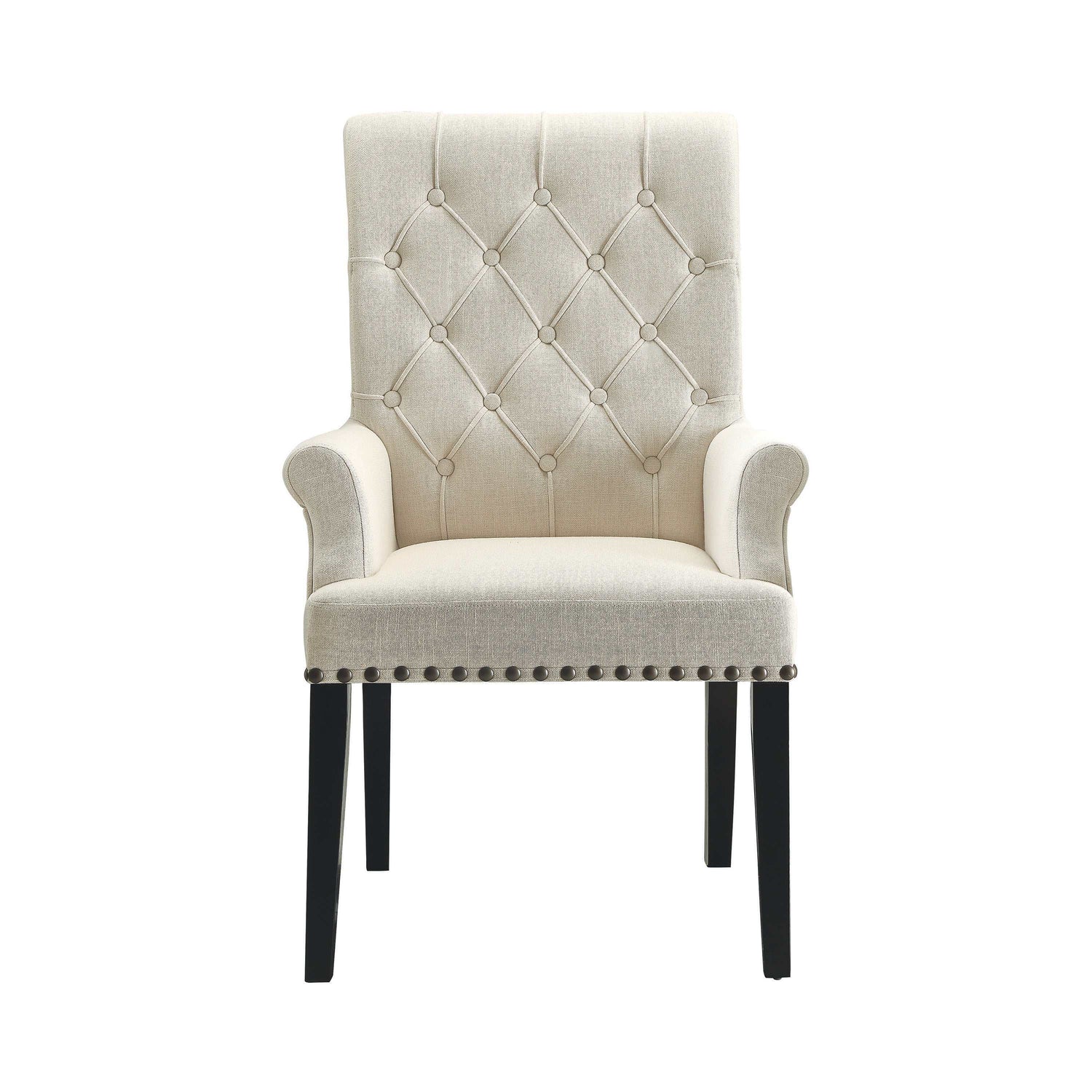 Seat guests in ultimate comfort. This dining armchair represents an artful upgrade to modernize a casual space while preserving traditional charm. Lovely cream upholstery infuses light and a fresh ambiance. Button tufting on its seat back joins sleek nailhead trim to add captivating accents. Dark finish legs provide the perfect contrast to complete a fabulous design package.