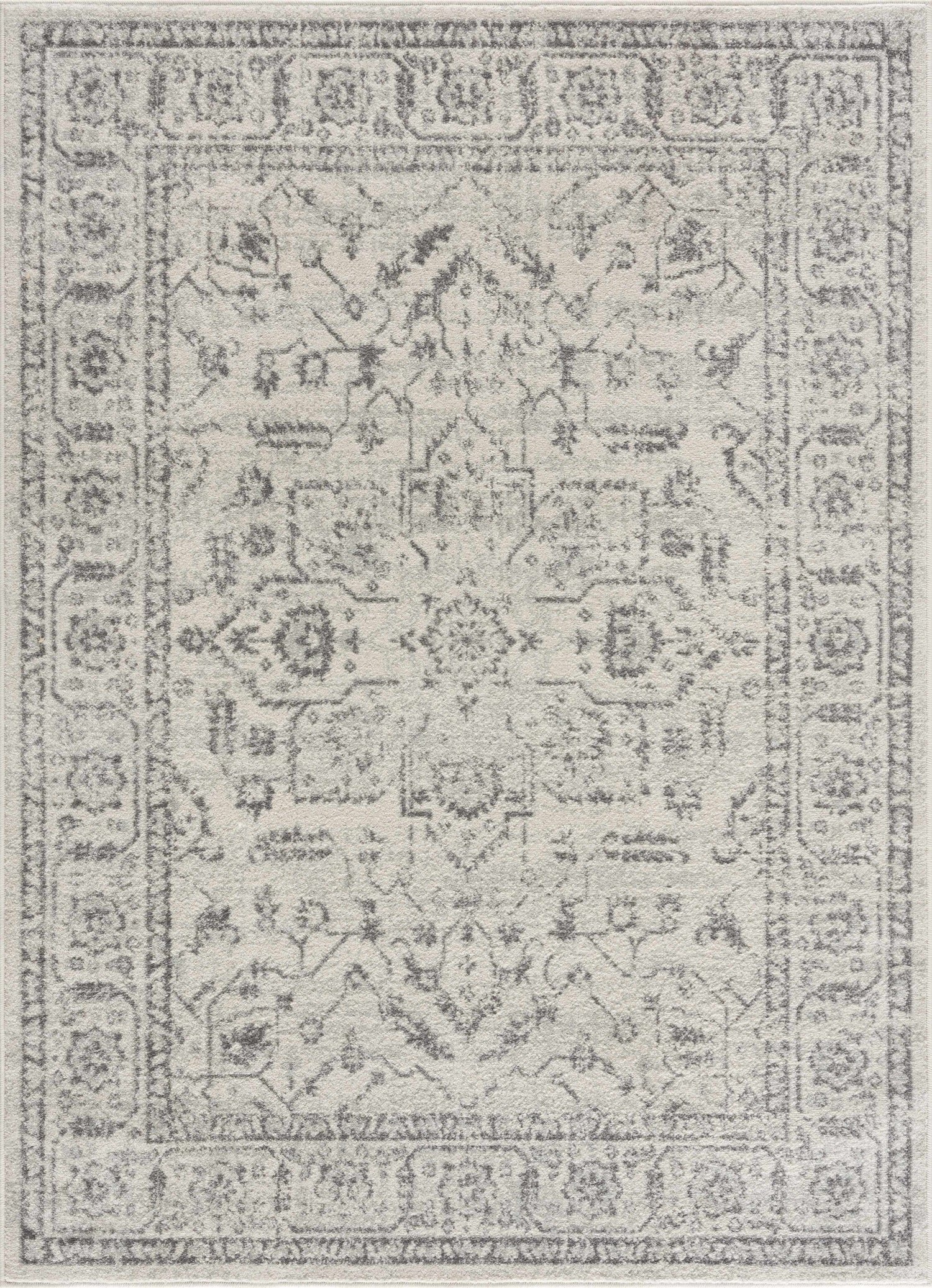 About: This Persian-style updated traditional rug is perfect for living rooms, bedrooms, or any other indoor space. It features a beautiful oriental pattern in a minimalist style with a stunning array of boho vintage distressed colors, including grey, beige, and white. |