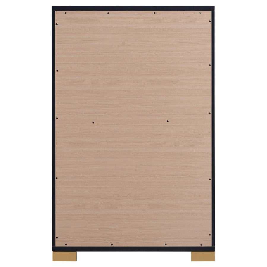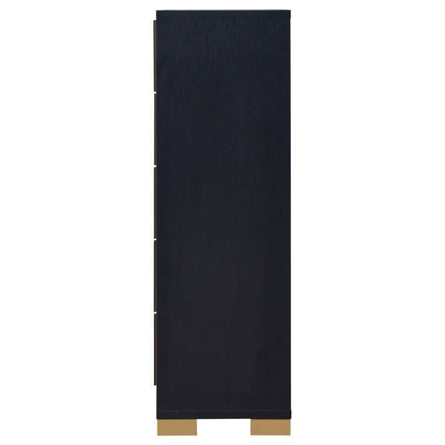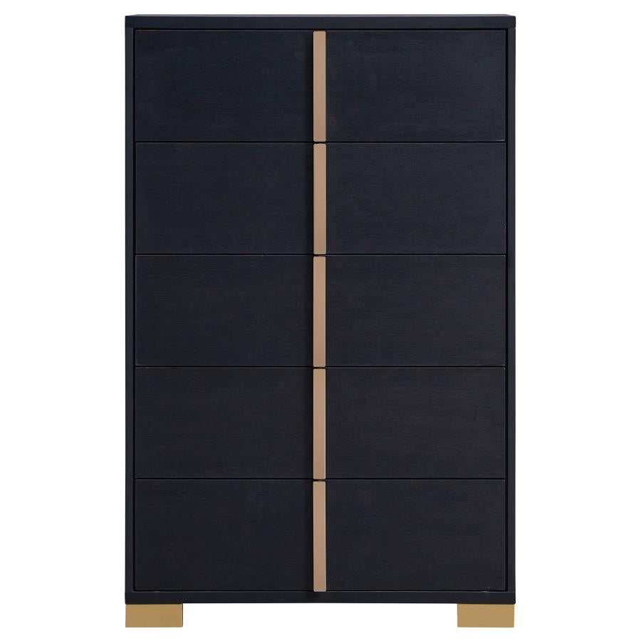 Minimalism never looked so elegant as it does in this elegant five-drawer chest, an excellent option for your updated bedroom ensemble. Modern design details produce a chic vertical chest with an Art Deco vibe and tons of storage space. Made of wood products, this five-drawer chest features a versatile finish with accenting from gold finish metal, placed carefully to emphasize a geometric linear effect. Store incidentals and accessories in drawers operating smoothly on center metal glides. English dovetail drawer construction embellishes this chest’s quality, as vertical gold metal drawer hardware offers a unique impact.
