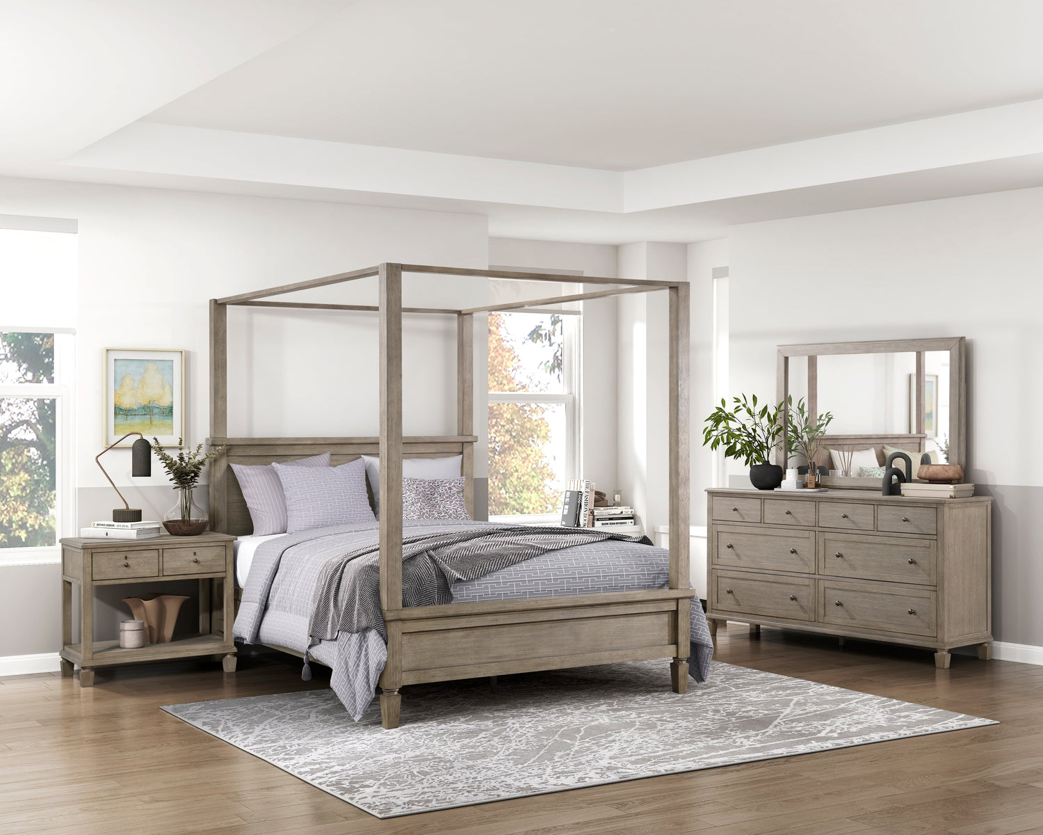 Transitional sensibility pairs with eye-catching elegance in the design of the Marceline Collection. The collection’s queen canopy bed draws immediate attention, it’s unfettered profile a magnificent focal point in your bedroom. The oak veneer of the collection features a gray oak finish.