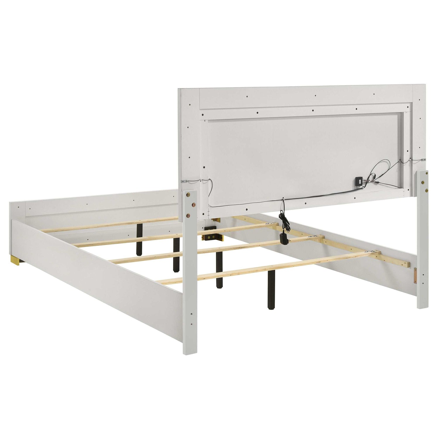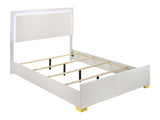 Explore the possibilities of modern features that render this chic bed a haven for relaxation and a comfy place to sleep and lounge. A stylish yet minimalist design feature is perfect for anchoring your contemporary bedroom. Assembled of wood products and melamine laminate, it offers updated and sturdy construction. Ethereal energy-efficient lighting frames its tall headboard, operated with a touch mechanism through headboard-mounted buttons. Gleaming gold metal finish feet are petite yet noticeable.