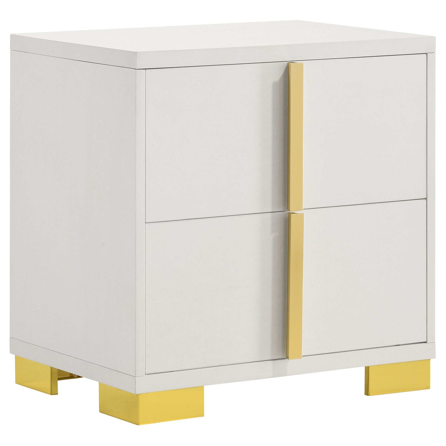 Cool white and warm gold create a compelling, modern ambiance for a stylish contemporary bedroom set. Centered on clean-lined silhouettes, the set features a modern bed complete with a squared headboard with built-in LED lighting that creates the right mood for relaxing evenings. The light is operated with a touch switch on each side of the headboard, assuring it's in easy reach. Storage pieces add roomy drawers with vertical gold pulls, and the dresser is topped in a framed mirror that adds to the airy feel of this set. Bracket feet complete the set, offering reliable stability and just the right hint of modern glam sophistication.