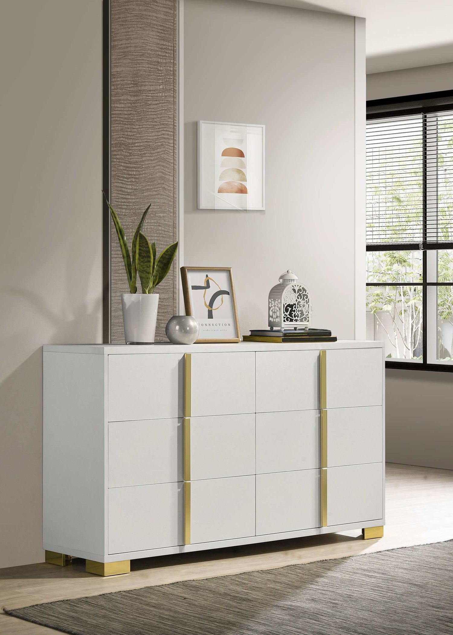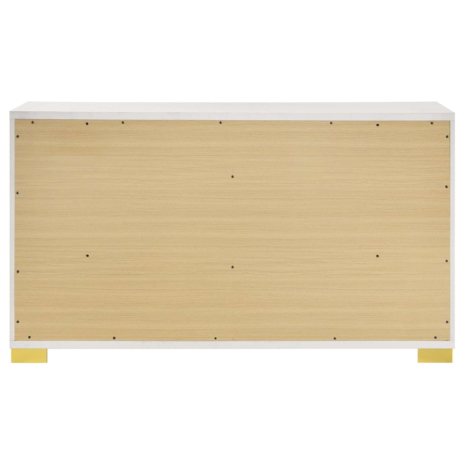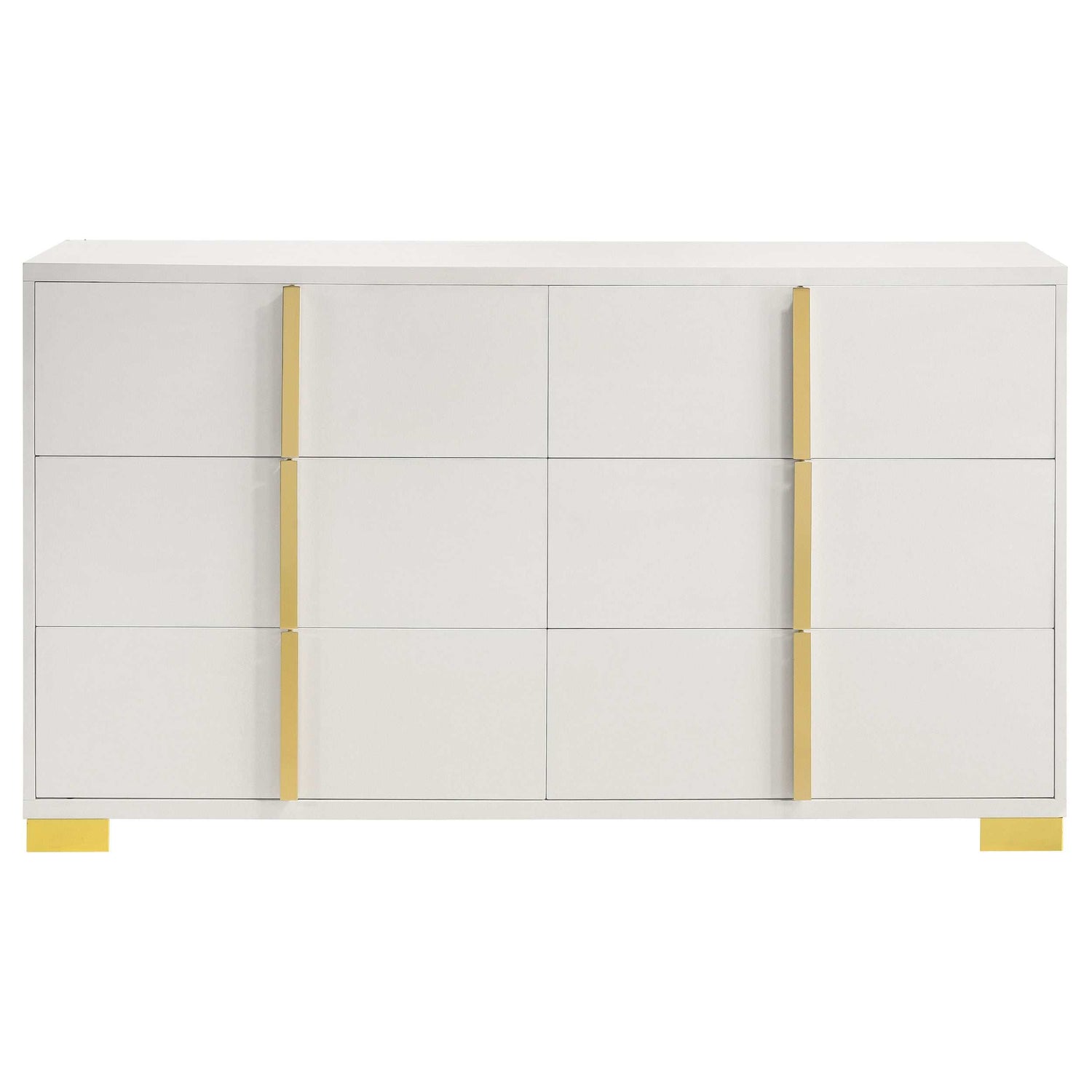 Soak up the sleek and simple yet compelling look of a six-drawer dresser with a dramatic aesthetic that changes the tone of your contemporary bedroom. Modern design details produce a chic vertical dresser with an Art Deco vibe and tons of storage space. Made of wood products, this six-drawer dresser features a versatile finish with glam accenting from gold finish metal, placed carefully to emphasize a geometric linear effect. Store incidentals and accessories in drawers operating smoothly on center metal glides. English dovetail drawer construction embellishes this dresser’s quality, as vertical gold metal drawer hardware offers a unique impact.