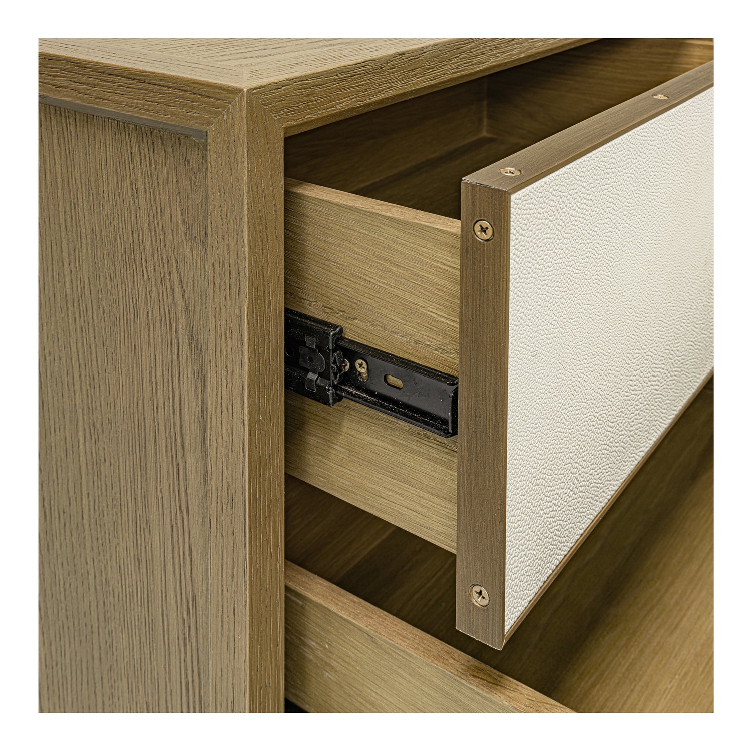 - Antique gold metal frame between wire-brushed oak frame & white shagreen door. Oak veneer top & side panels