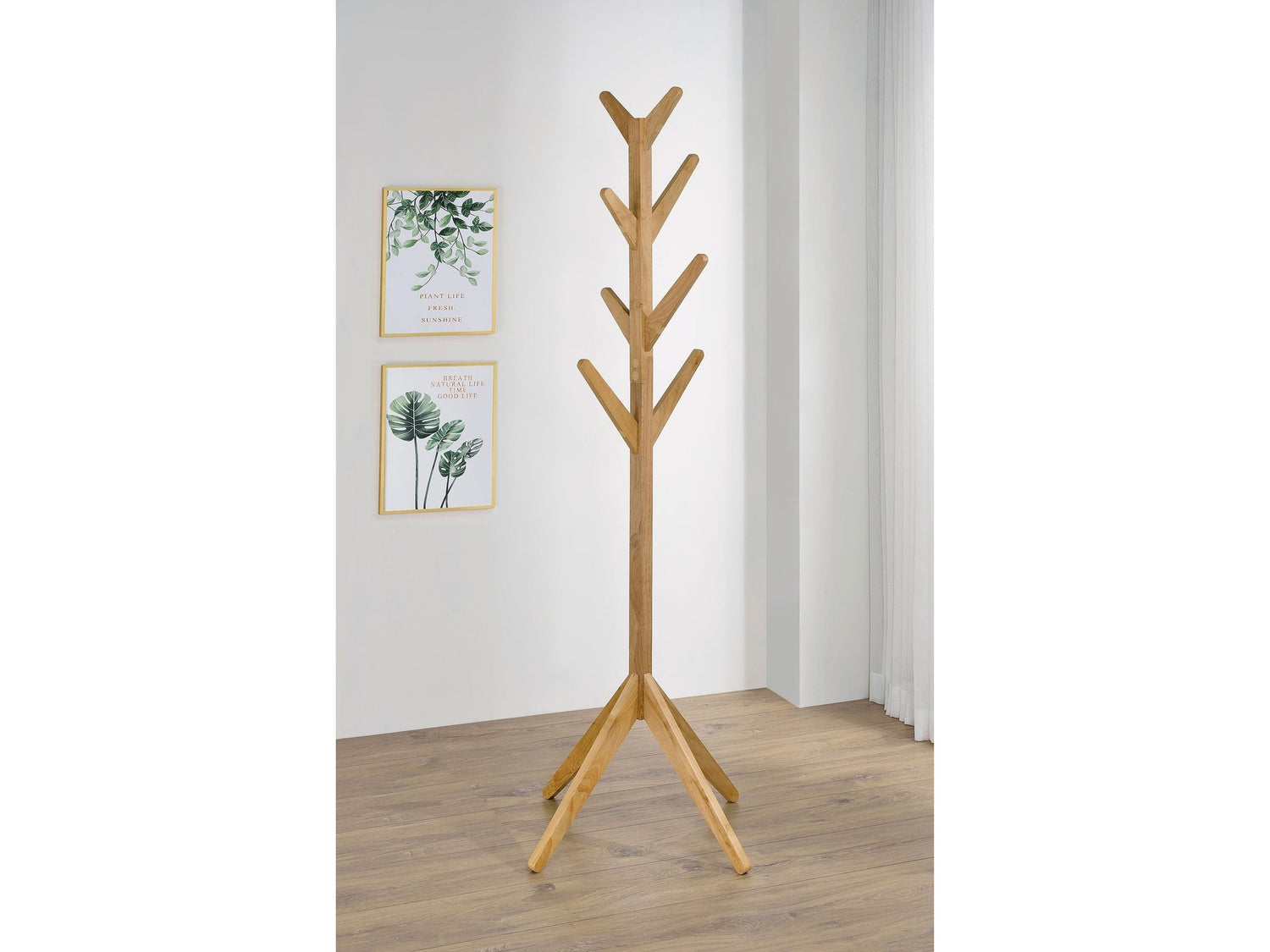- Includes: One (1) coat rack- Solid rubber wood coat rack in natural oak finish
