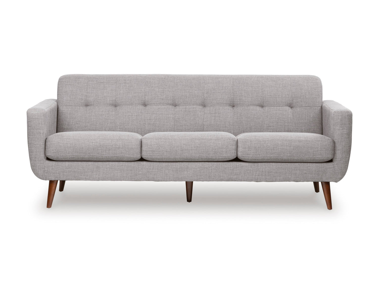 This sofa blends classic mid-century charm with a modern touch. Flared legs add a hint of retro style, while sleek track arms give it a contemporary edge. Upholstered in a versatile gray fabric, it offers a clean, timeless look that complements any décor.