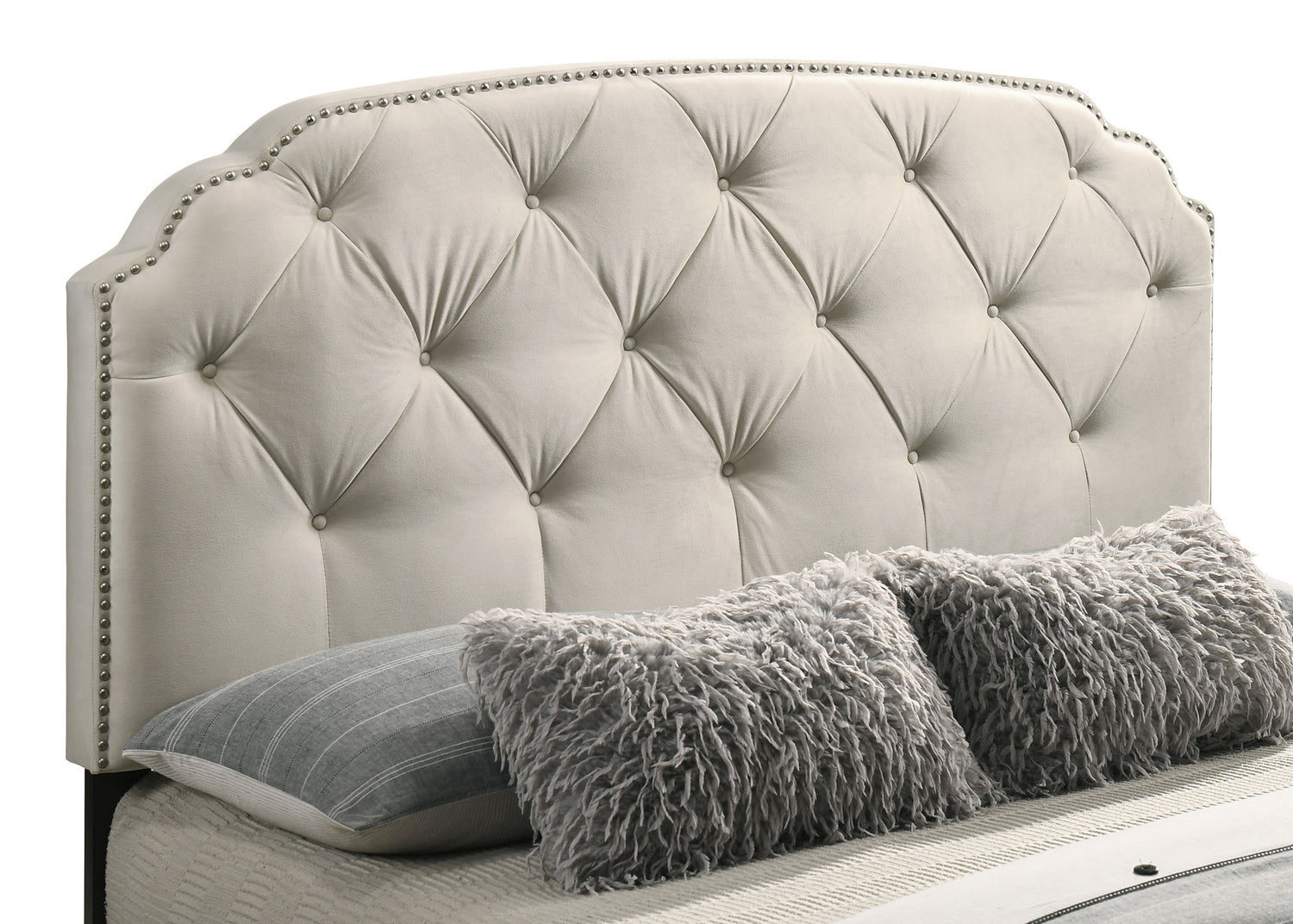 - Cream velvet upholstery with button tufting and nickel nailhead trim for elegance,