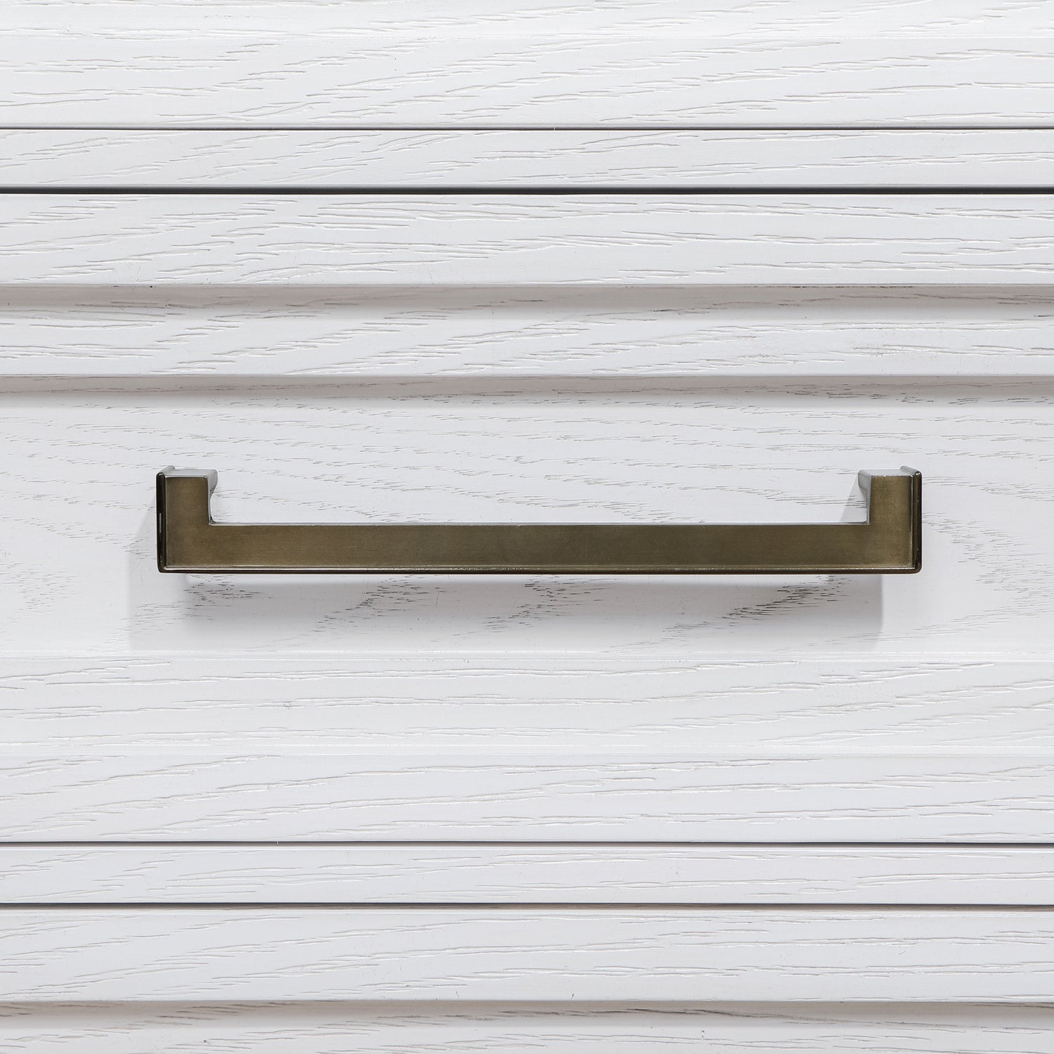 - Distressed white finish highlights wood grain details and bar hardware to create texture and depth