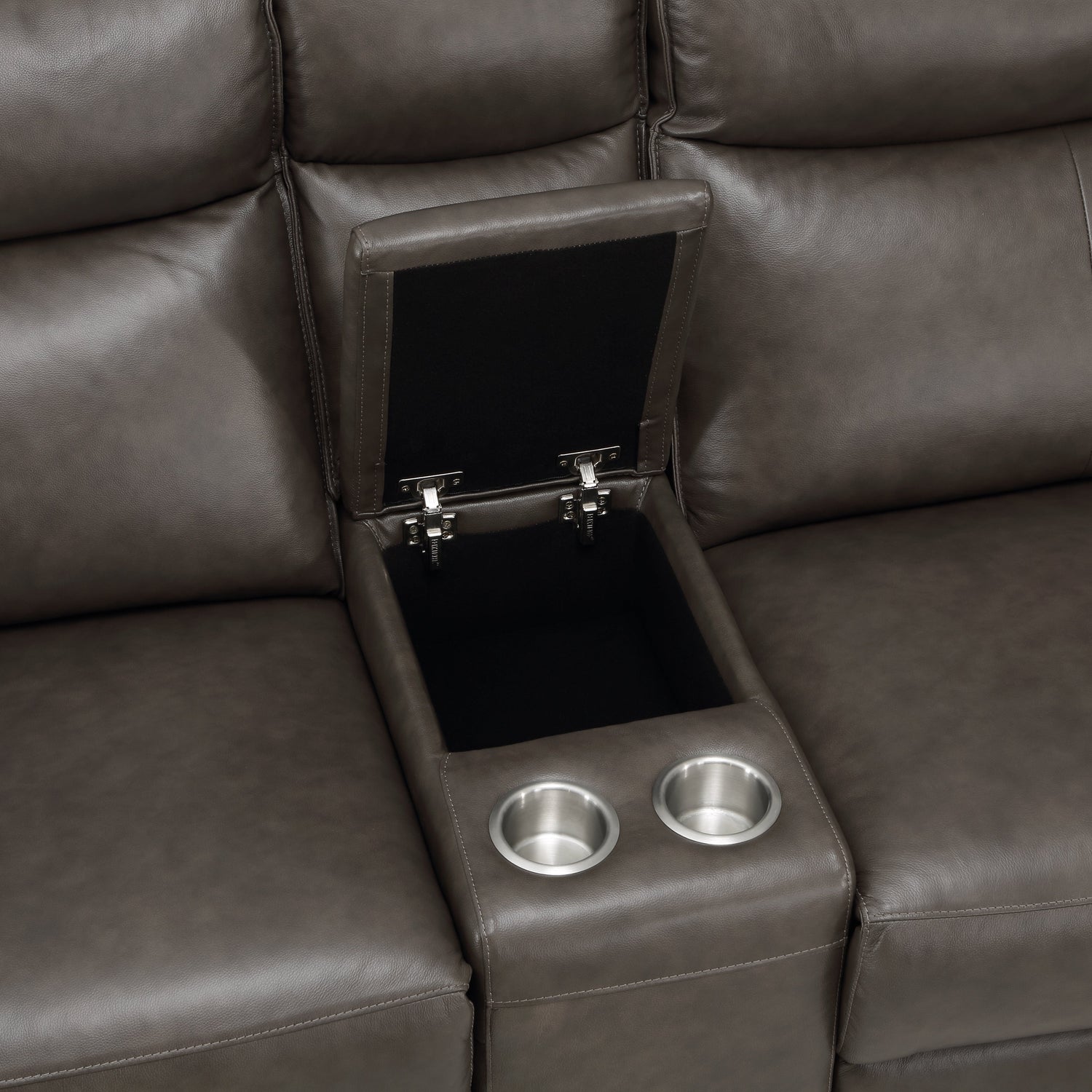 Providing ample seating for your friends and family is the Maroni Collection. The classic sectional shape features an armless chair, corner seat, console – with hidden storage and cupholders – which are book-ended by USB port enhanced end power recliners. Dark Brown top-grain leather covers the collection where your body touches with faux leather covering the remaining areas. The power reclining mechanism brings you to your desired position with a touch of the button. Providing additional function to the sectional is the USB ports and power operated headrests that allow you to further customize your comfort experience.