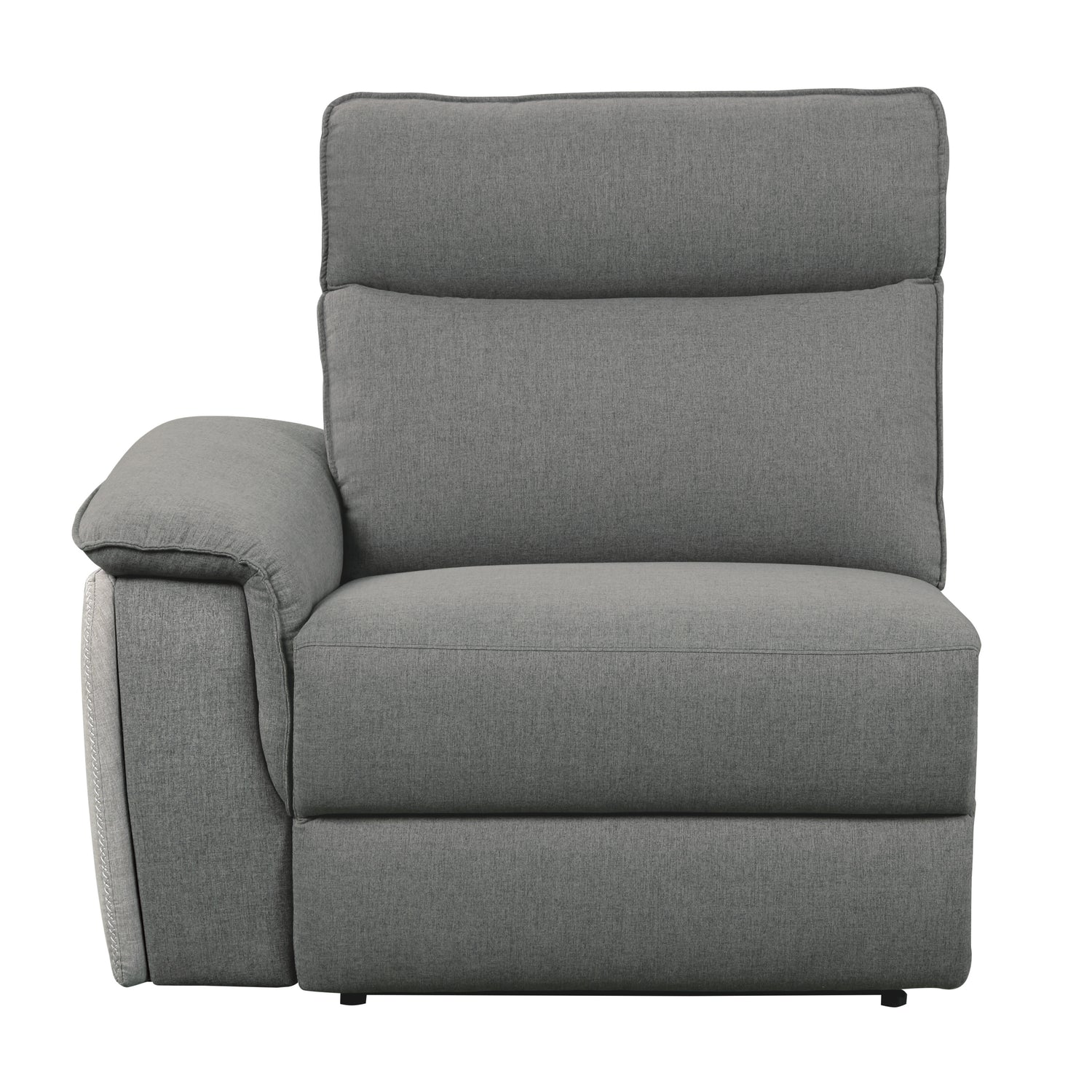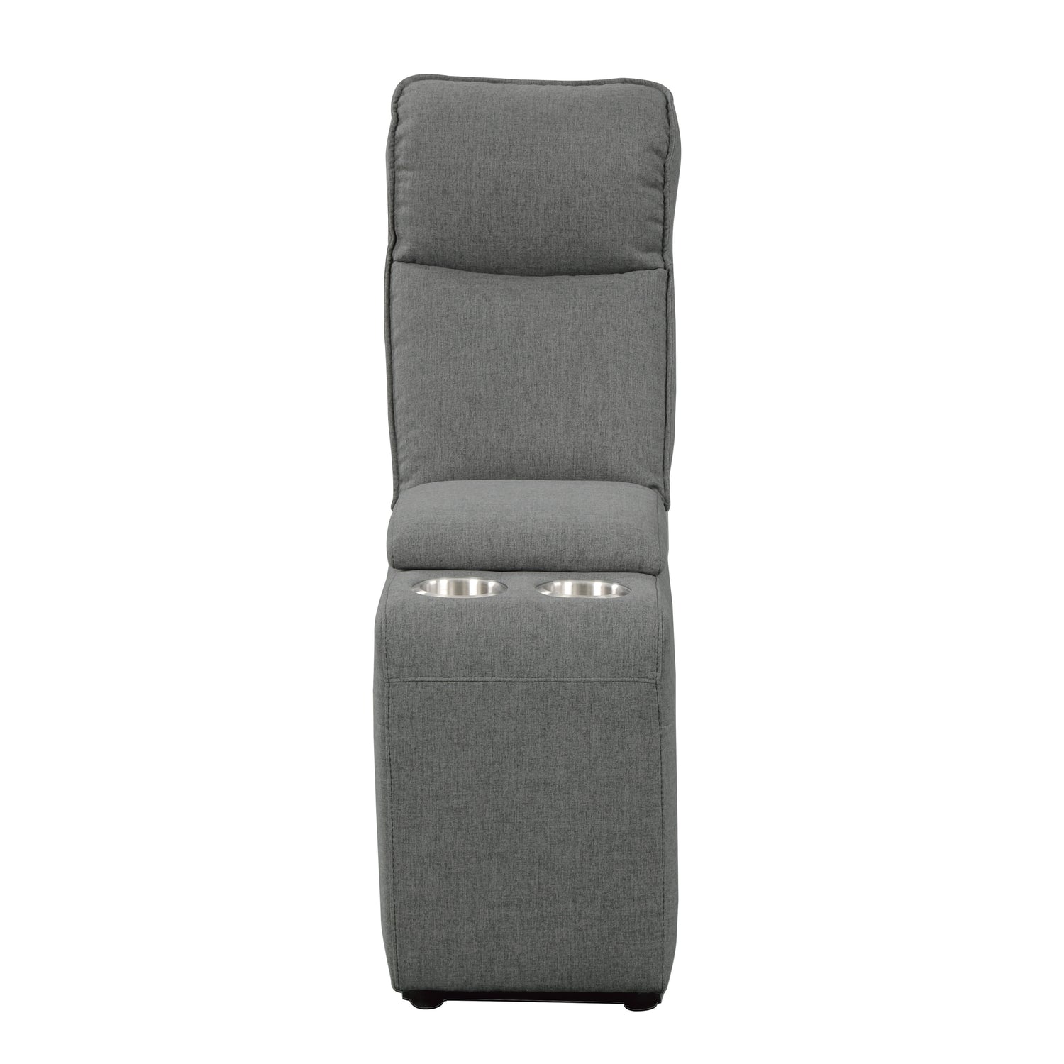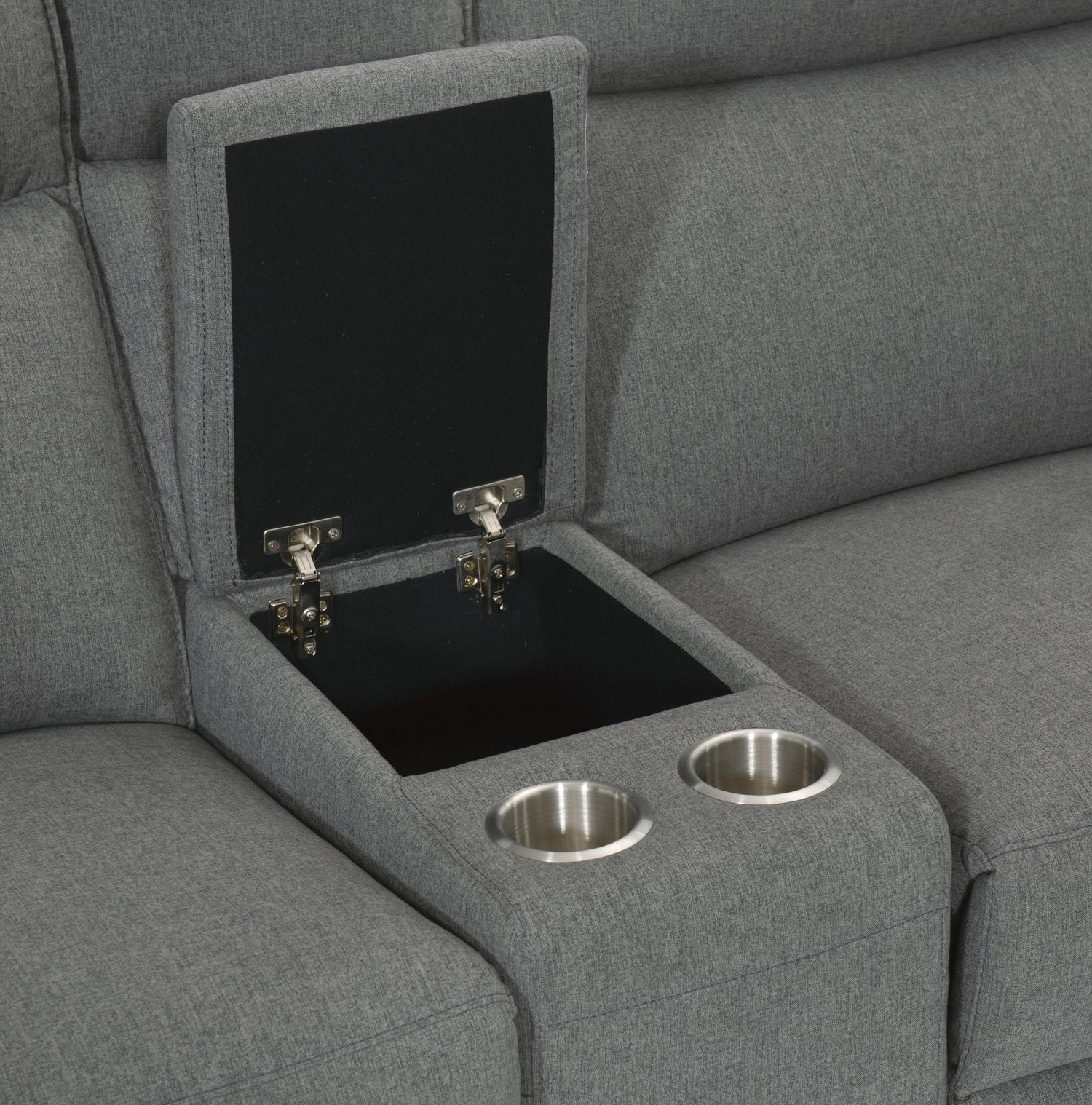 Providing ample seating for your friends and family is the Maroni Collection. The classic sectional shape features an armless chair, corner seat, console with hidden storage and cupholders which are book-ended by USB port enhanced end power recliners. Gray fabric covers the collection providing a gentle touch. The power reclining mechanism brings you to your desired position with a touch of the button. Providing additional function to the sectional is the USB ports and power operated headrests that allow you to further customize your comfort experience.