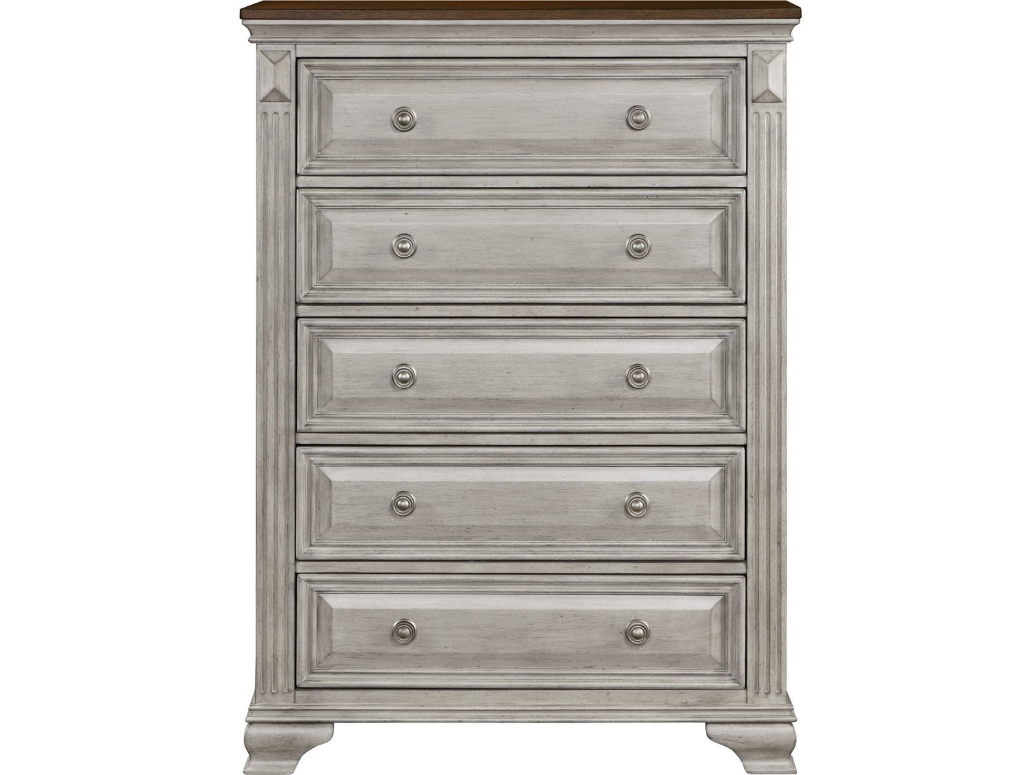 The stately presence of the Marquette Collection is steeped in traditional accenting, culminating in a refined look for your bedroom. The chest features picture frame molding, routed pilasters and a two-tone gray and brown finish over oak veneer. The drawers of the chest are accented with antique bronze-finished knob hardware.