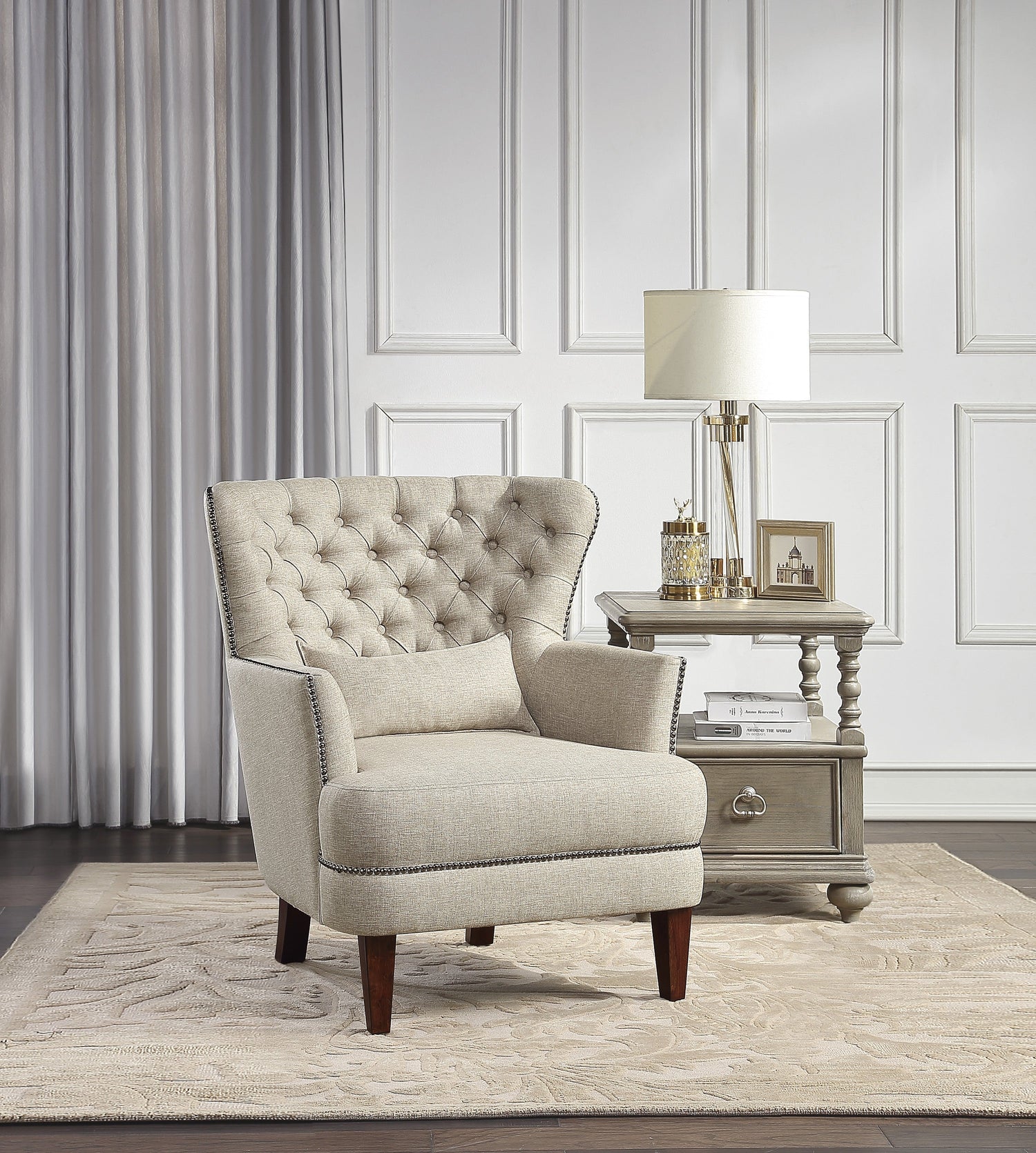 The elegant profile of the high flair-back Marriana Collection, lends distinct accent to your traditional living space. The beige fabric is paired with nailhead trim, wood legs and button tufting, each element providing distinct character to the timeless look of the chair.
