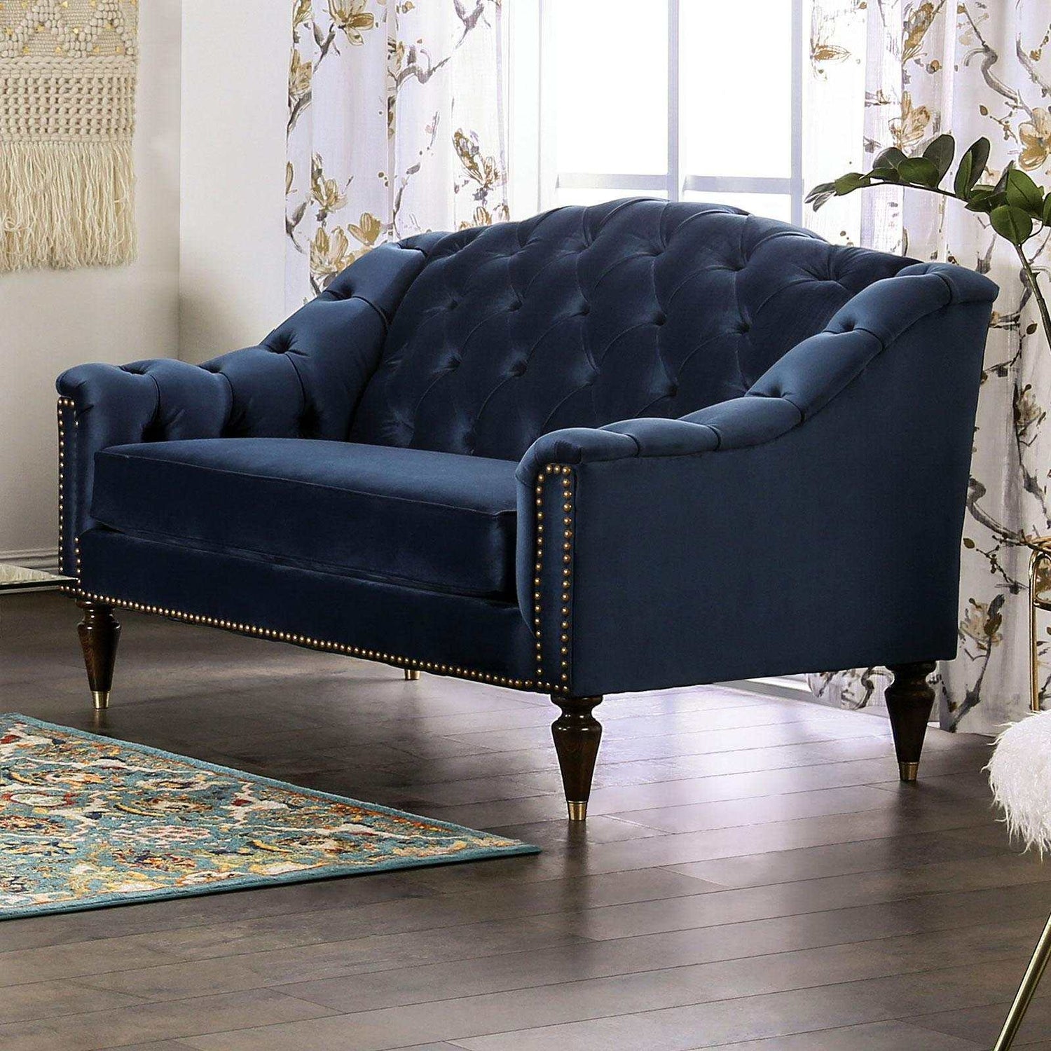 Posh and elegant, this sofa is the perfect focal point for your living room. It's rich in traditional flair; the deep tufted backrest and arms gives off a majestic flair, while the nailhead trim radiates undeniable class. Meanwhile, the off-beat, deep indigo color allows this piece to be the center of attention in a boho chic setup, surrounded by an assortment of patterns and fantastic textures.