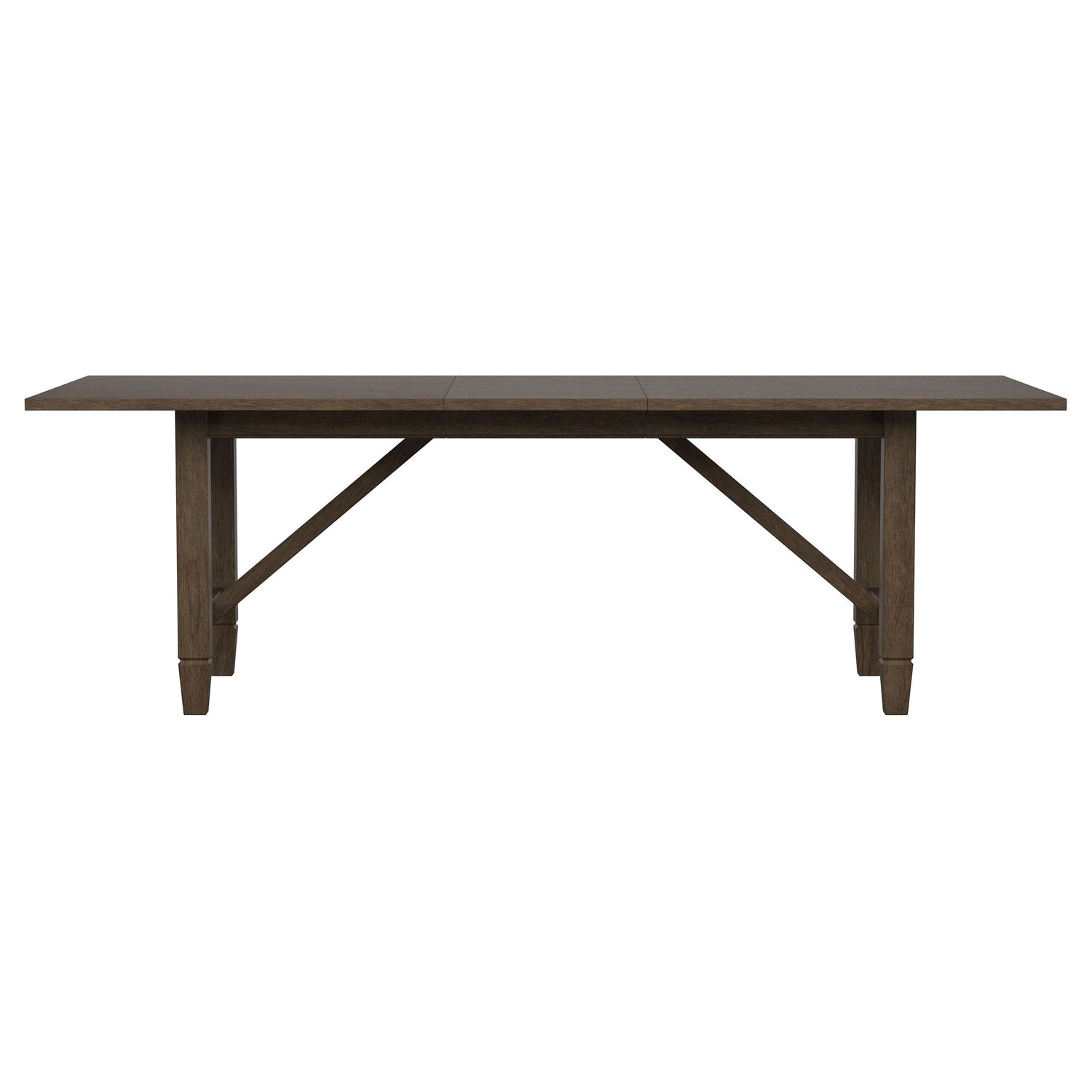 - Warm, natural brown wood grain finish pairs with a trestle style table base