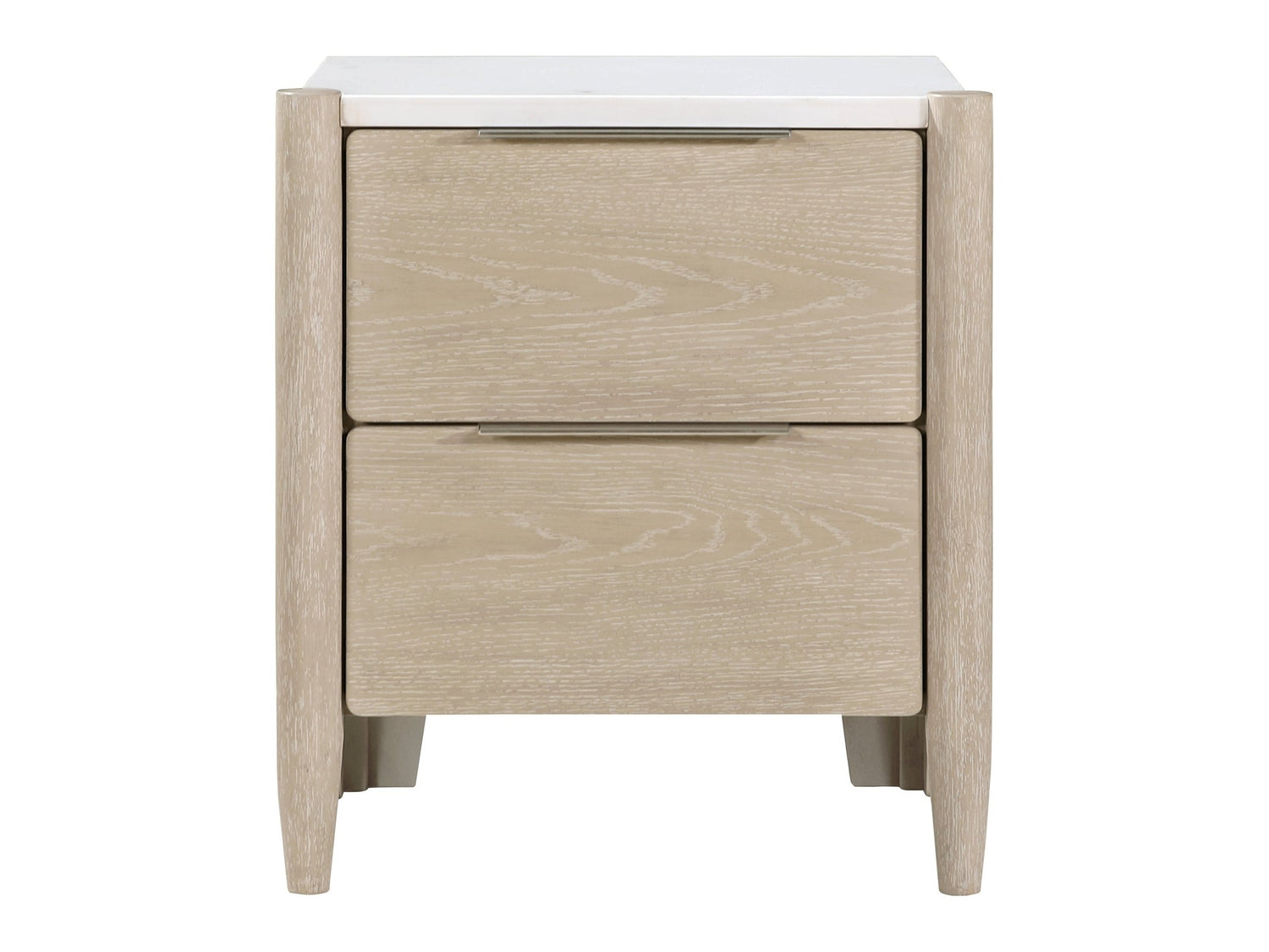 Soft modern lines comprise the design of the Matteo Collection, while convenience features provide functional accent to your bedroom. The light oak finish over oak veneer lends a light and airy aesthetic to your bedroom. Charging ports are conveniently mounted on the back of the marble-topped nightstand.