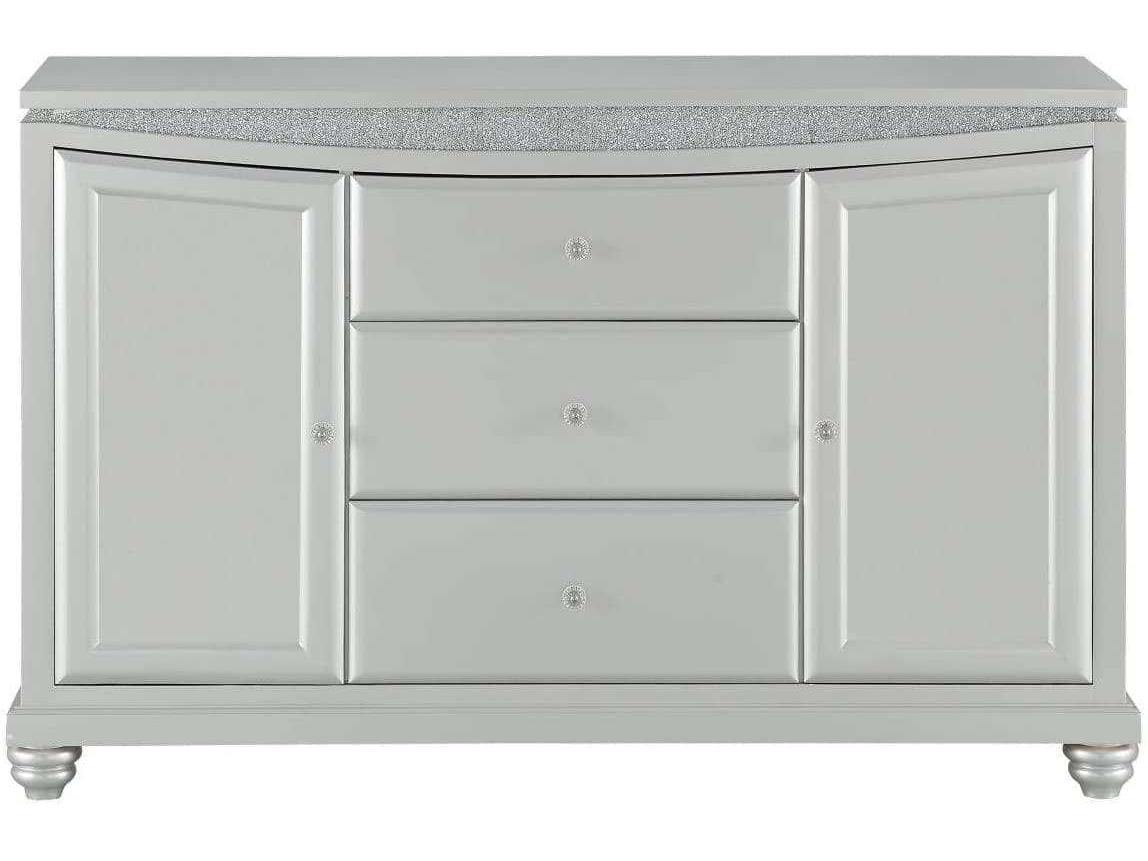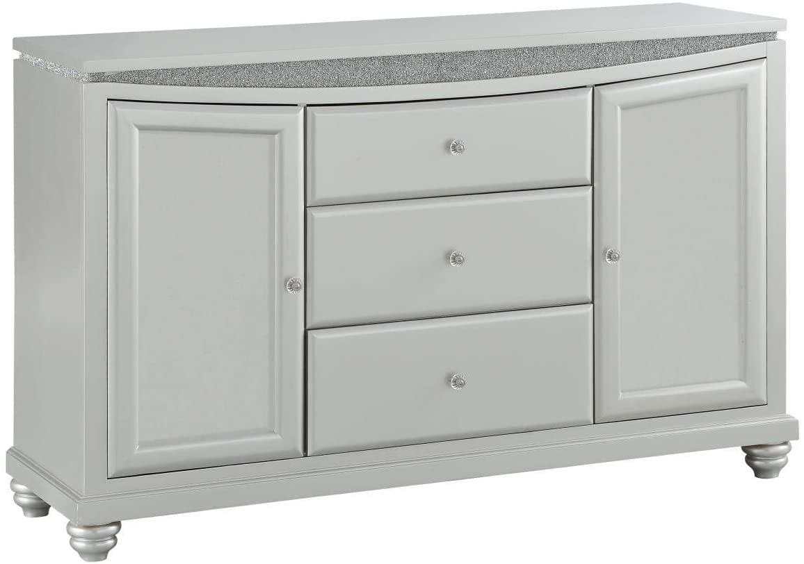 Make your dining room the centerpiece of your home with the Maverick server. This unique server features a Platinum finish with sparkling Rhinestone trim resting on bun-turned legs that is both elegant and inviting. This beautiful server has two cabinets with doors and an additional three drawers, providing plenty of storage and display options. This server is a welcome addition to any dining area.