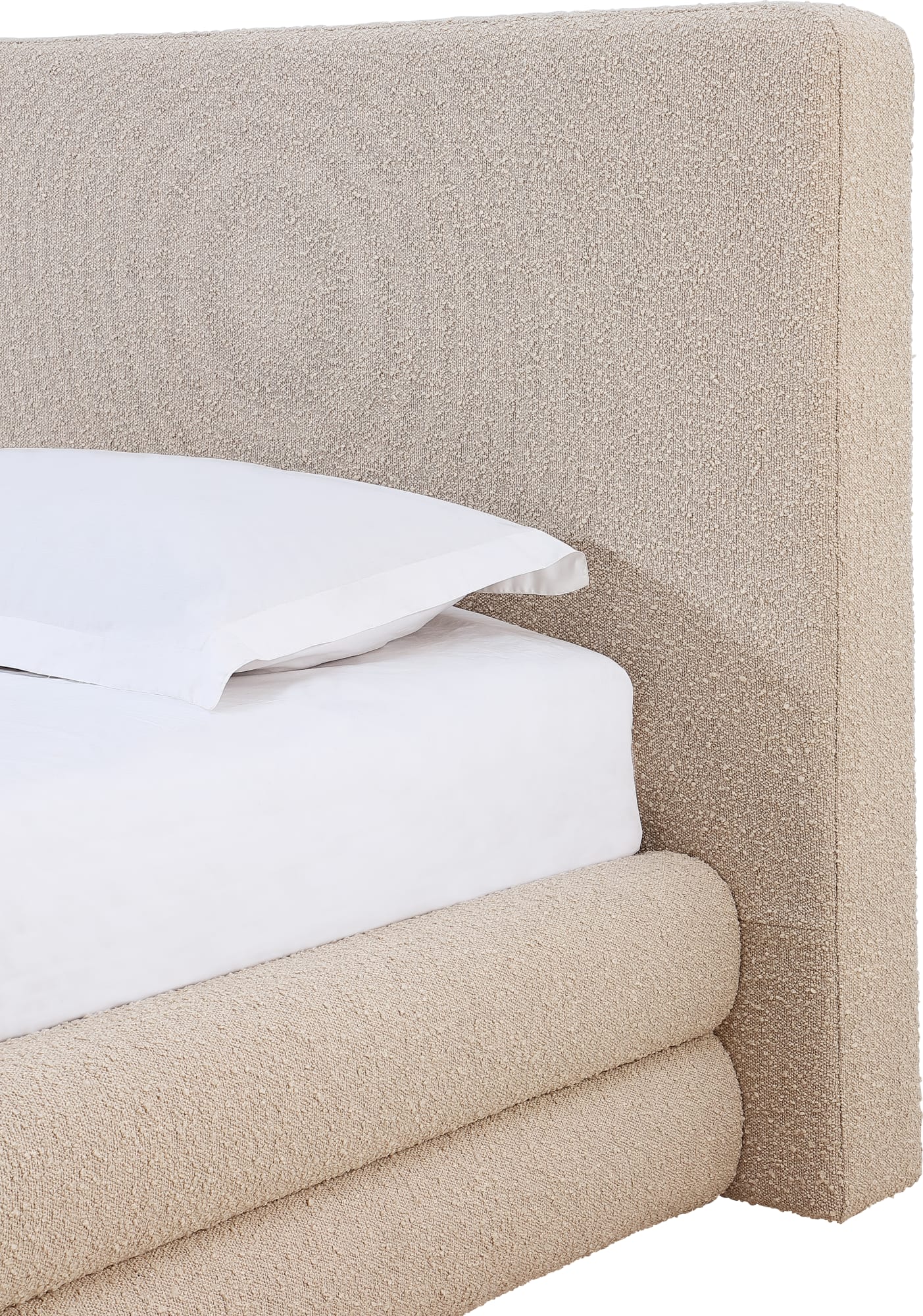 - Boucle fabric is a soft brown natural tone that pairs well with light brown woods and wicker Distinctive stacked cylindrical platform frame