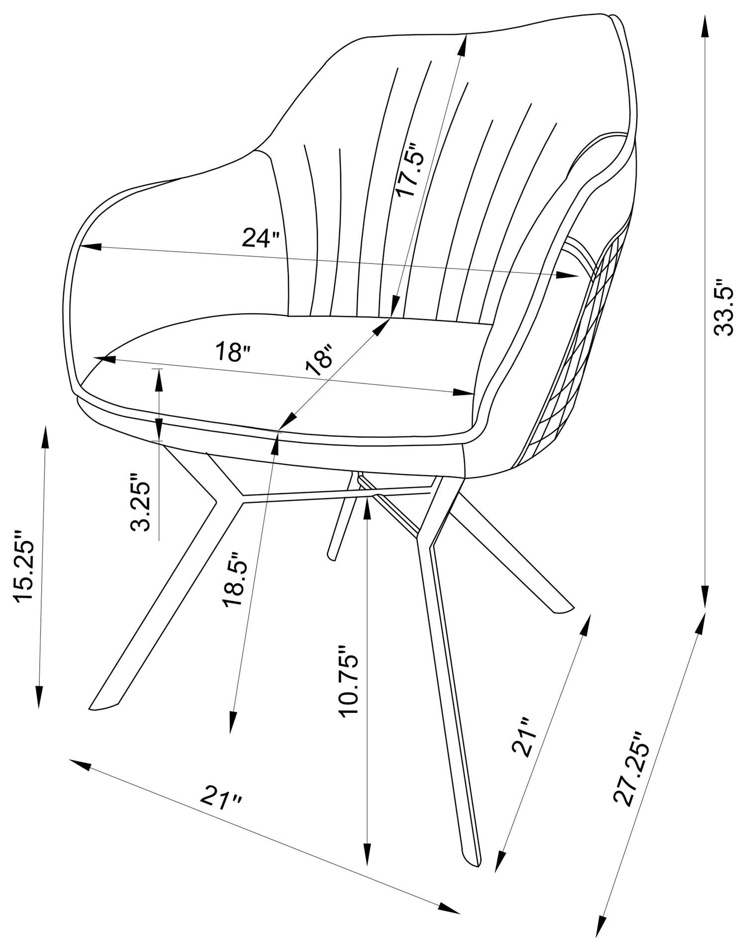 Retro vibes and mixed materials elevate the look of this contemporary dining chair. An upholstered seat features elegant, sloped armrests and a blue leatherette interior, wrapped with a diamond-quilted brown leatherette back fabric for a subtle contrast. Welt trim details and a loosely gathered back create a timeless, yet comfortable and casual touches. This dining chair rests also on a metal base with a gunmetal finish that offers a sleek, stylish look. Slim angled legs flare outward dramatically, offering up a vintage throwback.