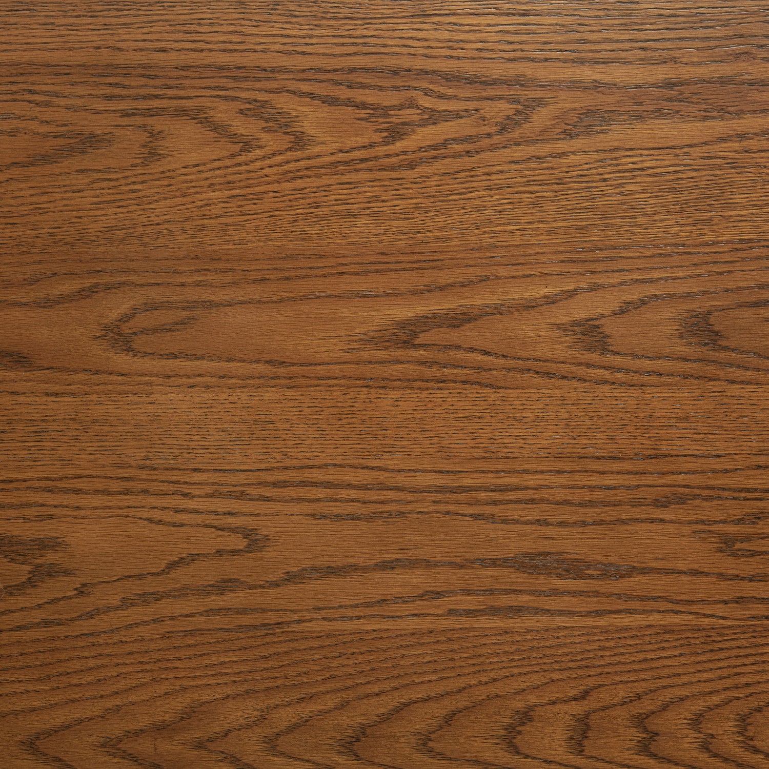 - Warm dark oak finish enhances wood grain and adds rustic character to the design,
