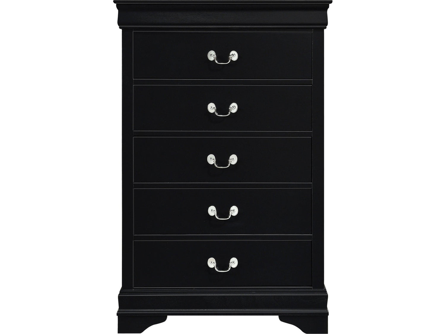 Traditional in design and modest in scale, the elegant Mayville Collection takes its design inspiration from the classic Louis Philippe styling. The Okume veneer of the chest is paired with a black finish and is accentuated by antique nickel tone drop handles.