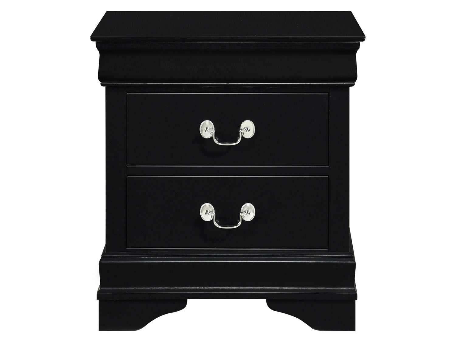Traditional in design and modest in scale, the elegant Mayville Collection takes its design inspiration from the classic Louis Philippe styling. The Okume veneer of the nightstand is paired with a black finish and is accentuated by antique nickel tone drop handles.