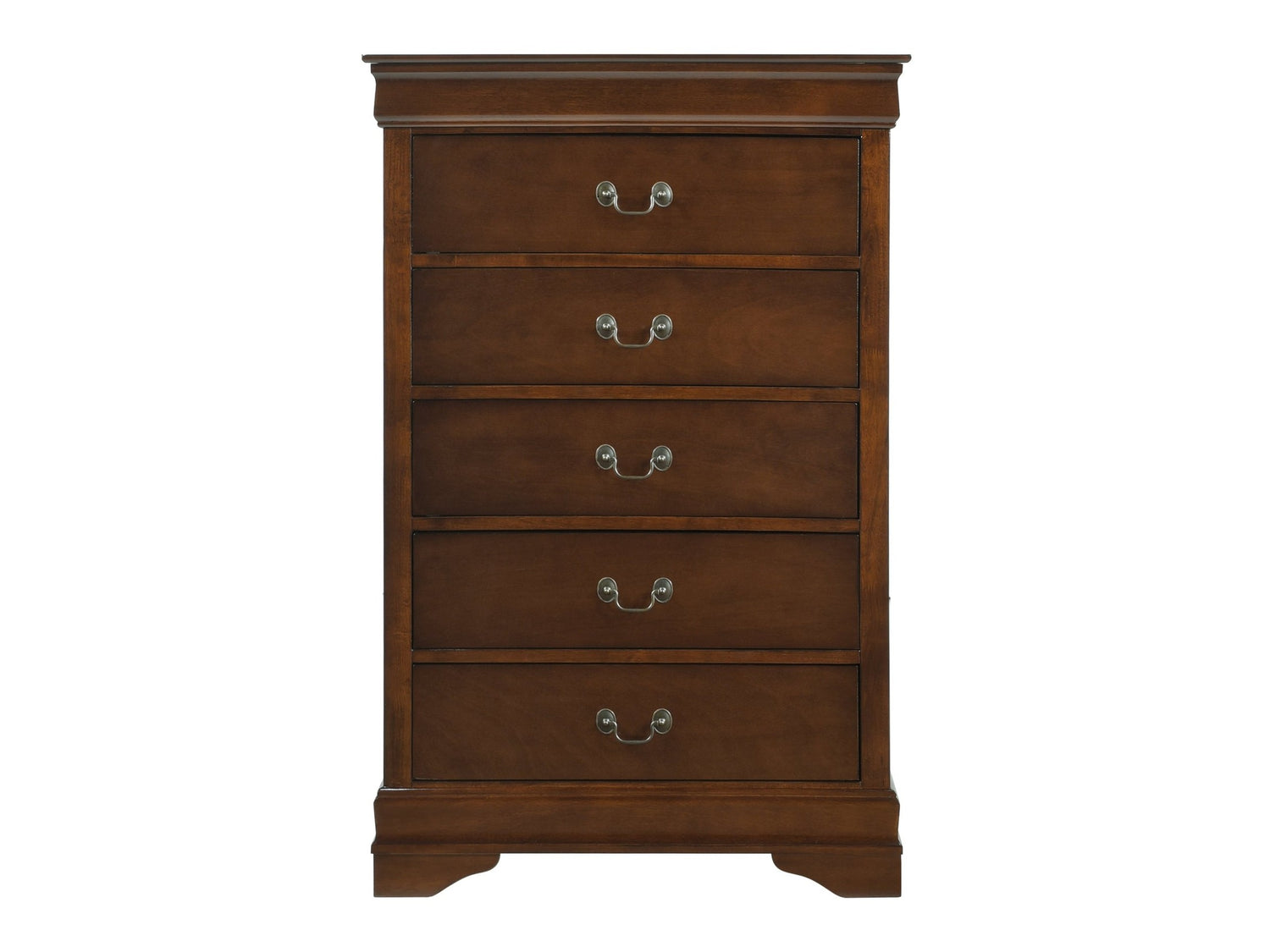 Traditional in design and modest in scale, the elegant Mayville Collection takes its design inspiration from the classic Louis Philippe styling. The Okume veneer of the chest is paired with a brown cherry finish and is accentuated by antique brass tone drop handles.