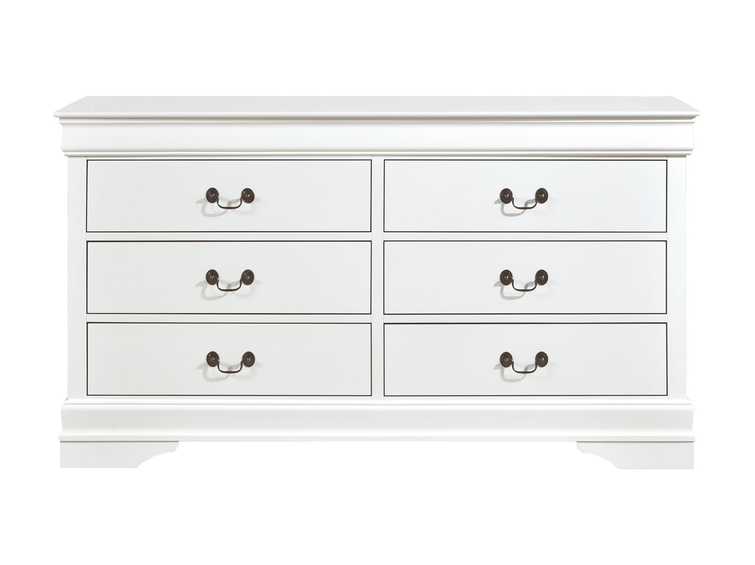 Traditional in design and modest in scale, the elegant Mayville Collection takes its design inspiration from the classic Louis Philippe styling. The Okume veneer of the dresser is paired with a white finish and is accentuated by antique brass tone drop handles.