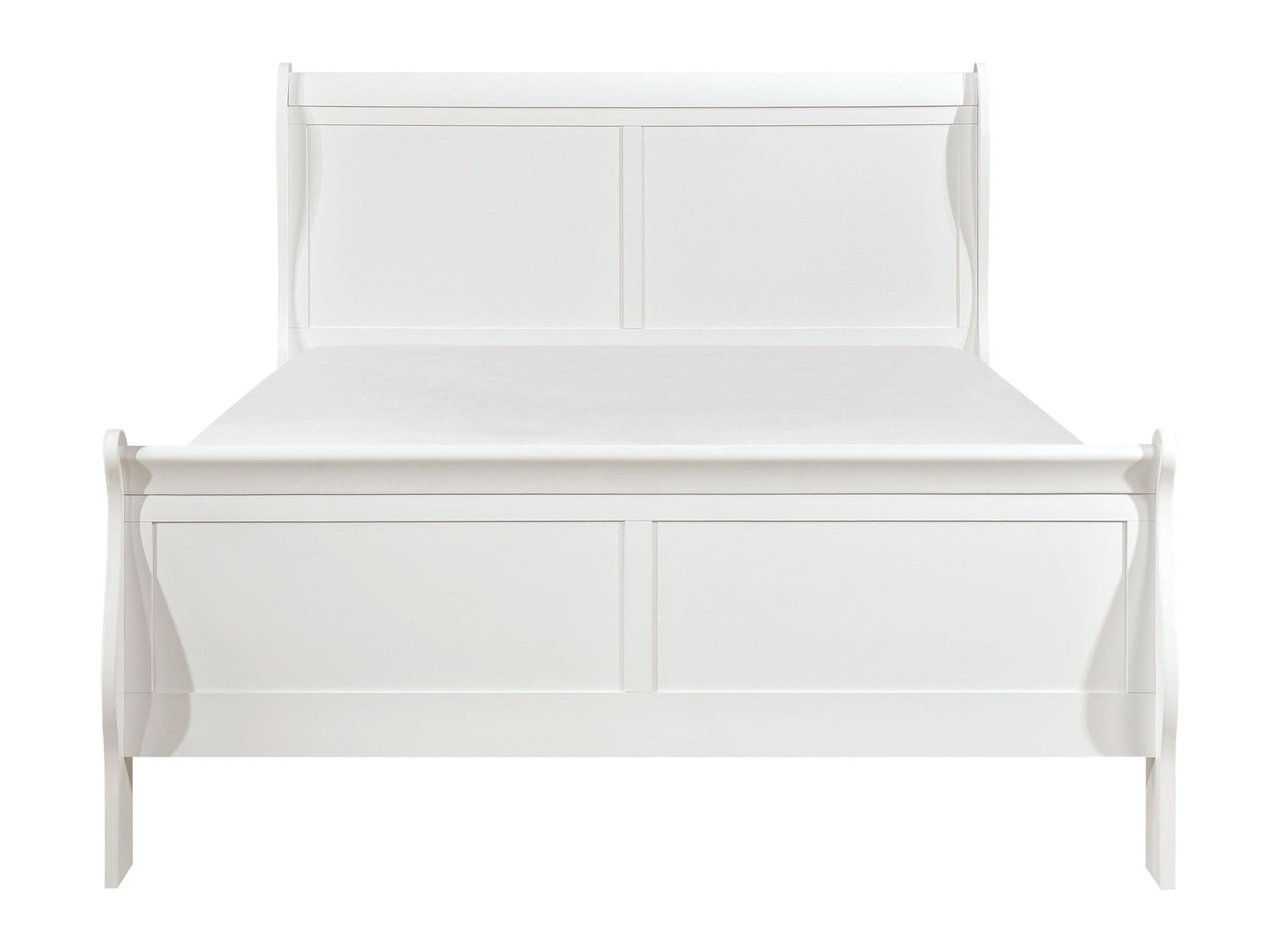 Traditional in design and modest in scale, the elegant Mayville Collection takes its design inspiration from the classic Louis Philippe styling. Burnished white finish lends timeless appeal to the traditional full sleigh bed.