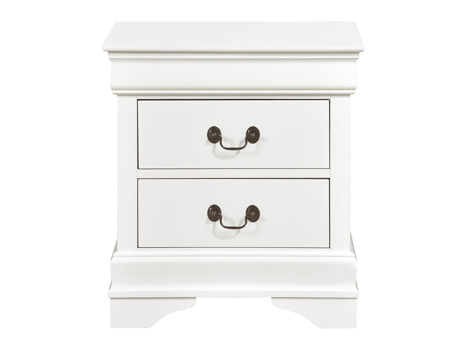 Traditional in design and modest in scale, the elegant Mayville Collection takes its design inspiration from the classic Louis Philippe styling. The Okume veneer of the nightstand is paired with a white finish and is accentuated by antique brass tone drop handles.