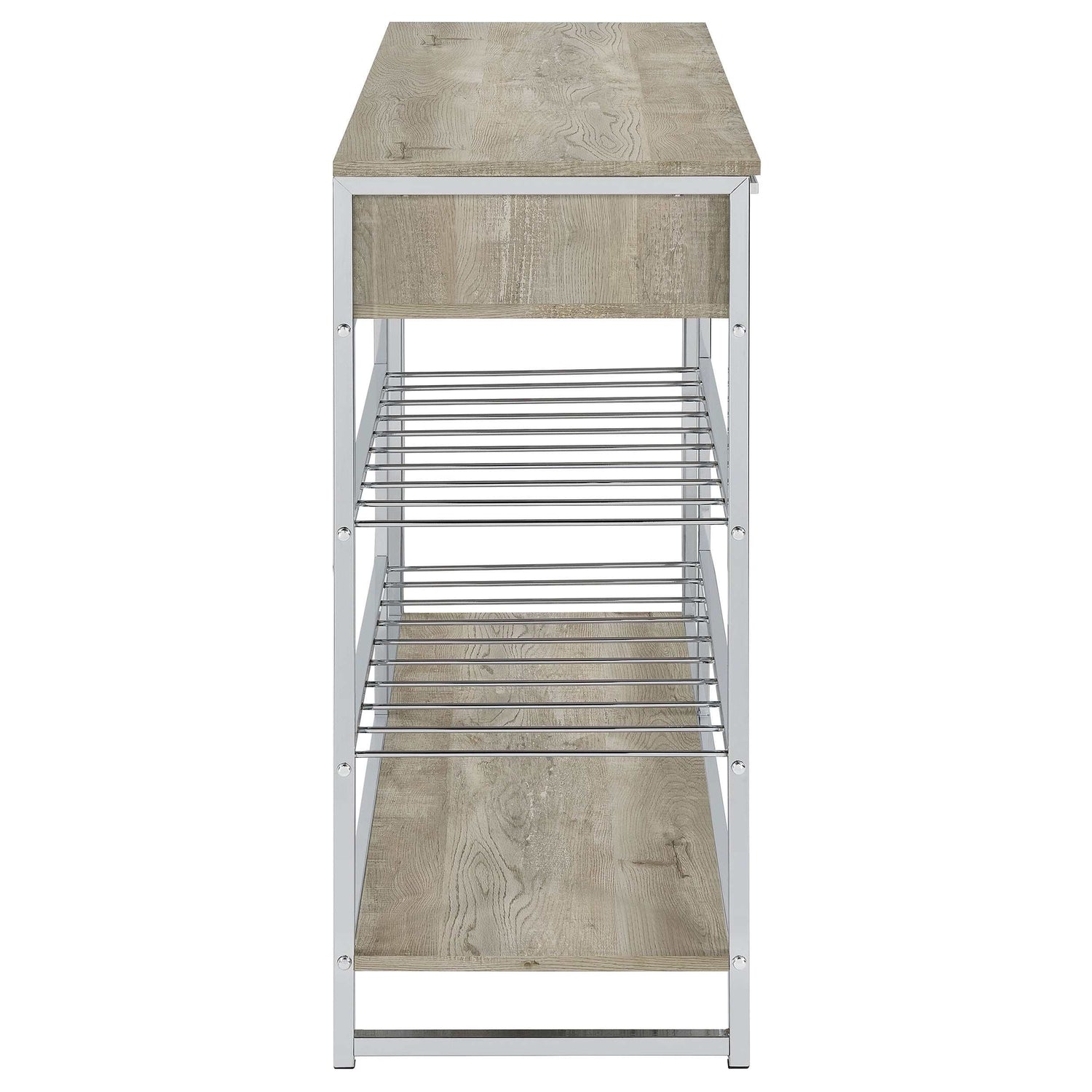 Your entertaining needs are filled with a sense of casual style and supreme organization as this bar cabinet provides space and configuration for a casual space. Make serving a breeze with a cabinet featuring gray finish wood products construction of an upper two-drawer cabinet and matching lower shelf. Minimalist metal framing adds a great optical benefit, with two slat shelves that accommodate dishware and stemware. Drawers open easily to make space for implements. This all-in-one bar cabinet offers a fresh, clean look and lots of convenience to organize an entertainment regimen.
