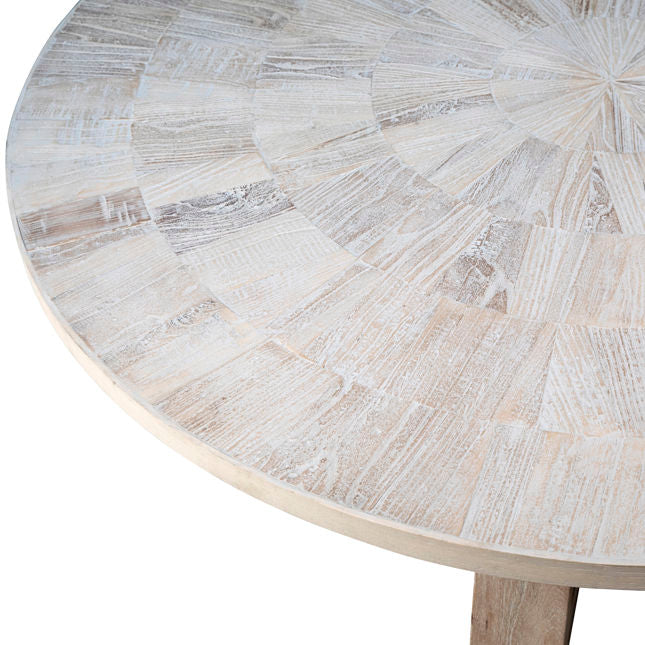 The unique profile of this 52' round coffee table offers an eye-catching focal point that is constructed from slabs of reclaimed elm wood for a richly layered woodgrain texture. A round tabletop and unique, angular legs showcase its modern influence and soft yet edgy design. Finished in a beautiful natural light warm wash seal.