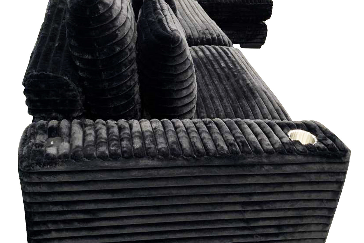 Midnight-Madness ll Black Jumbo Corduroy 3pc Reversible Sectional Sofa w/ Dual Cupholders & USB Ports