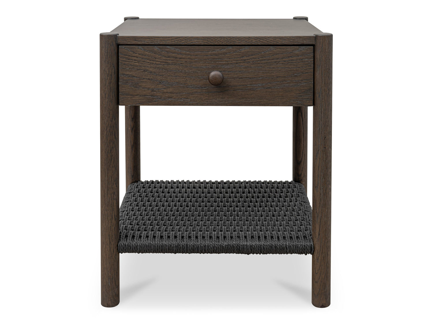 - Solid oak leg, wood handle with oak veneer top, side, front frame, & drawer. Black paper rope
