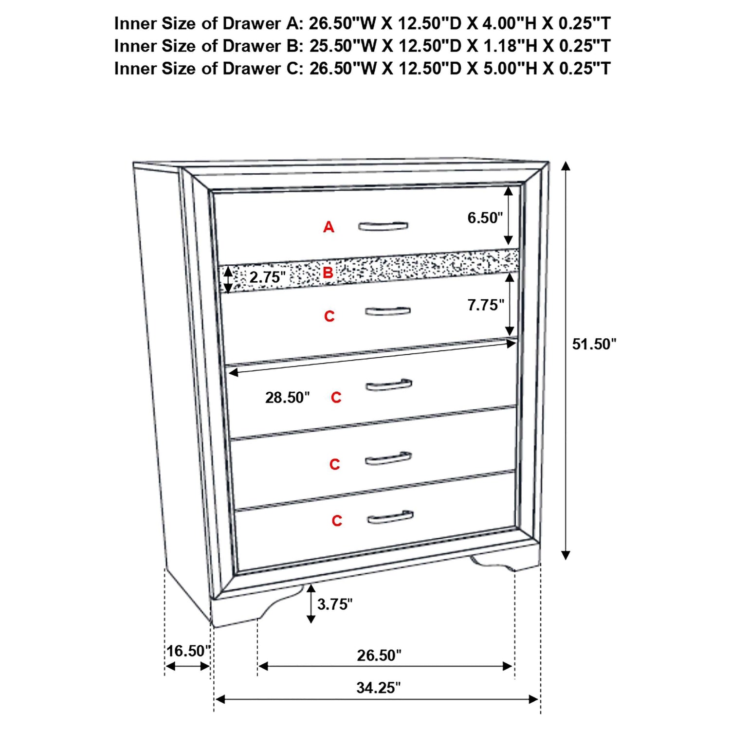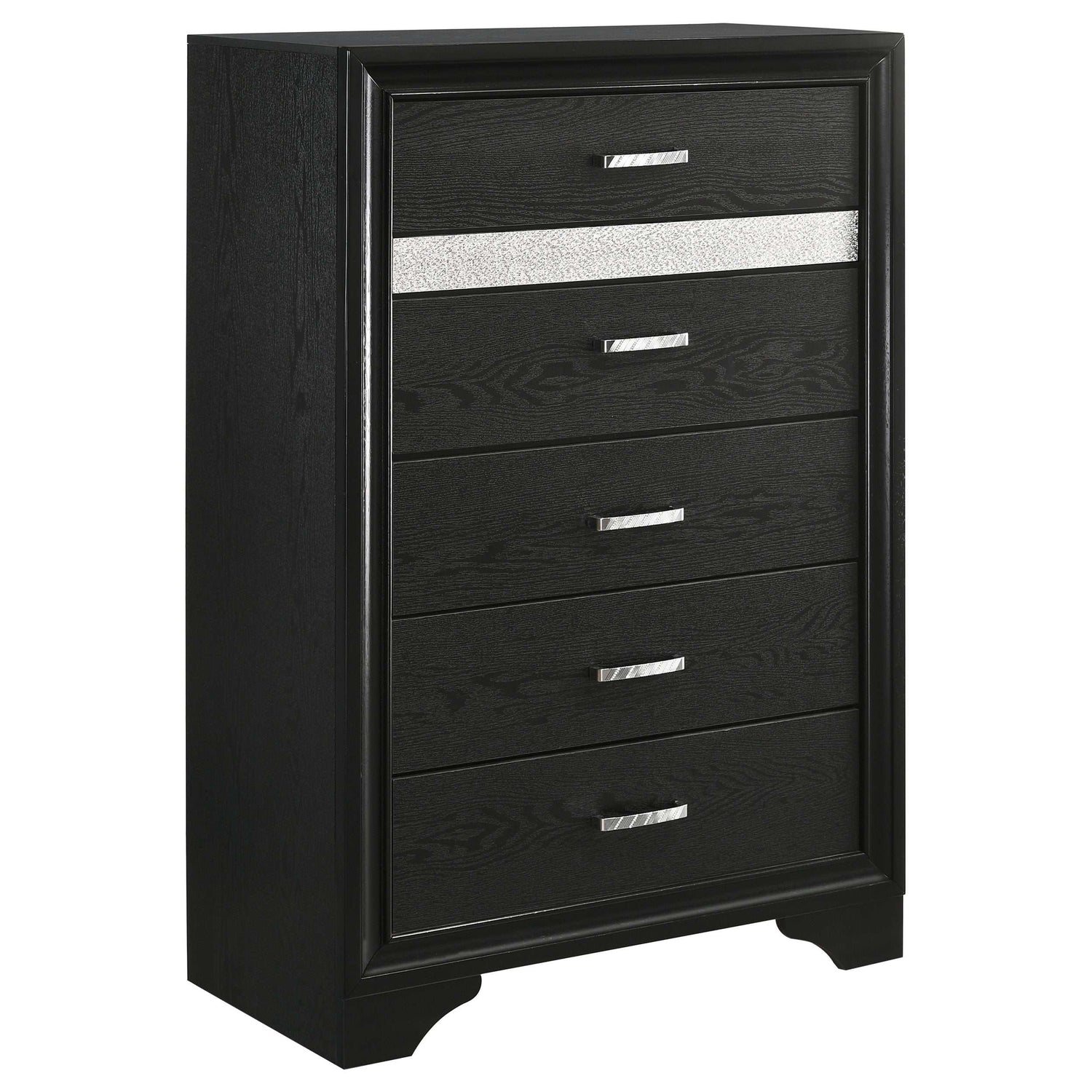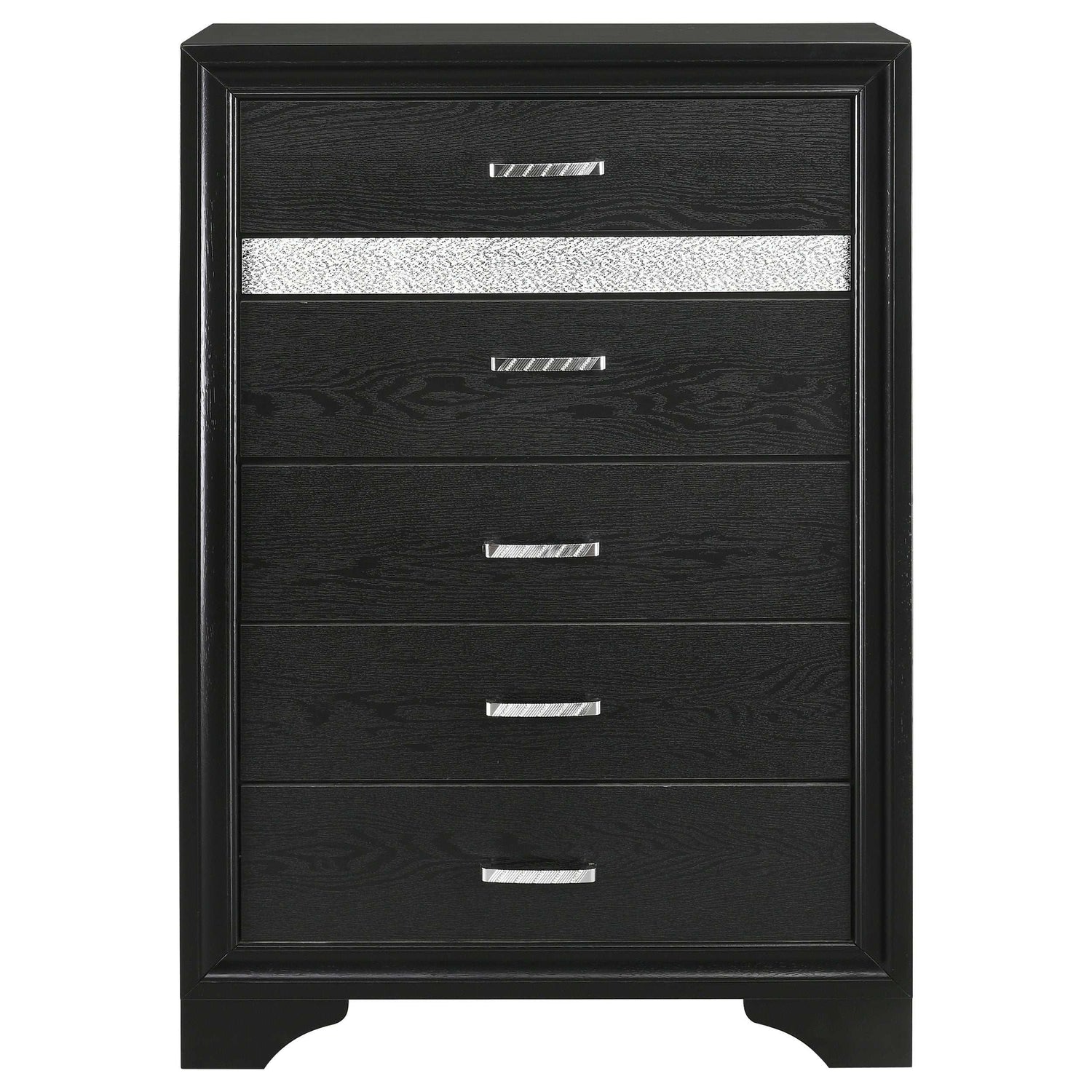 Stylish and ultra-chic, this glamorous, five-piece bedroom set is the ultimate in modern luxury. A bed, Nightstand: , dresser, mirror , and chest are all included, giving you everything you need to complete your bedroom ensemble. The mattress-ready platform bed offers the added bonus of footboard storage. The dresser, Nightstand: , and chest are also equipped with roomy drawers to maximize storage space. Glittery stripes and rhinestone detailing add a brilliant touch of bling to this exquisite bedroom set.