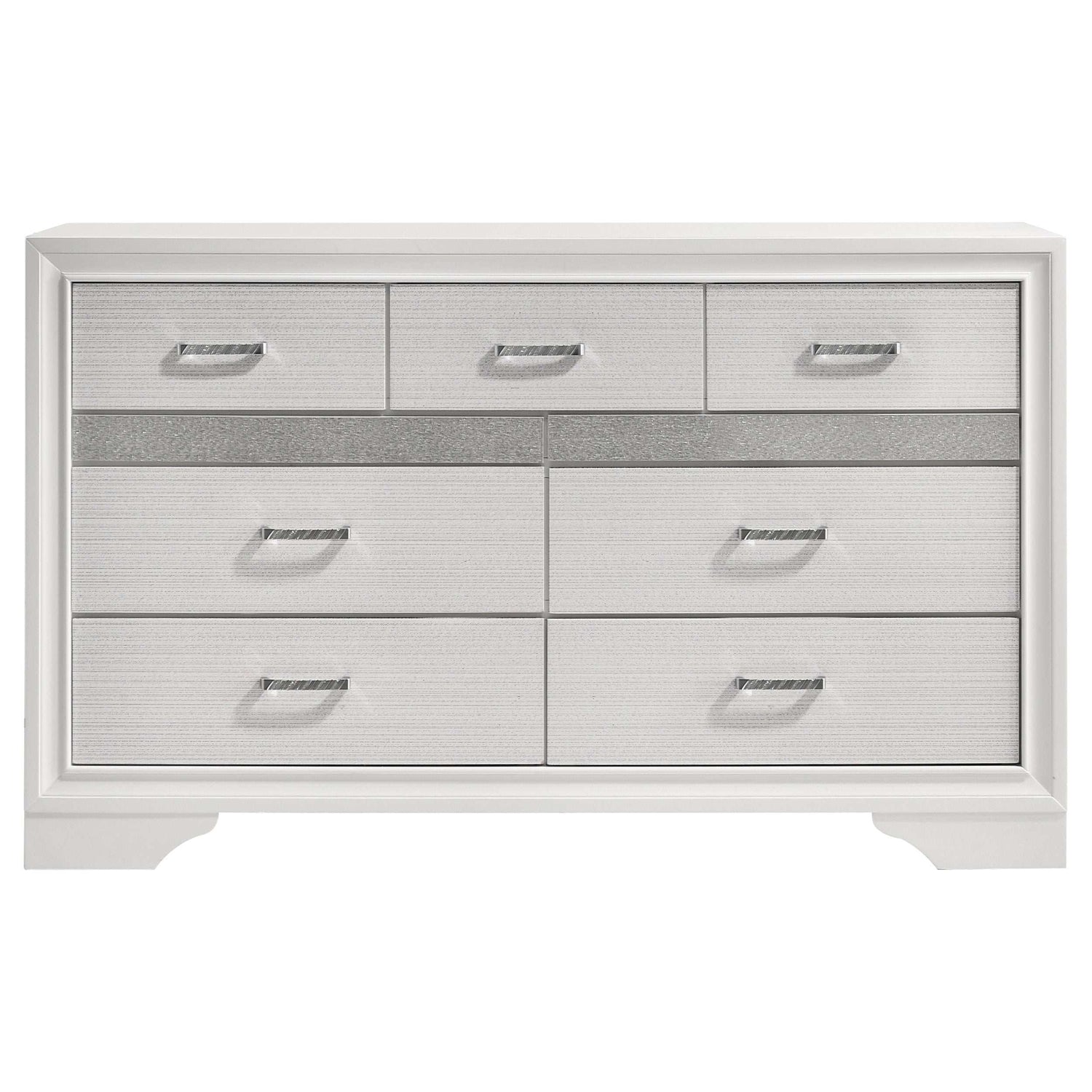 Create a stunning bedroom ensemble that's fit for modern royalty. Each gorgeous piece in this four-piece set flaunts silvery, sparkling accents for a truly glamorous look. The bed features a solid, straight silhouette and two storage drawers built into the base. The case pieces bring you even more storage space to keep your room looking neat and tidy. Available in a variety of colors and sizes, there's an option to bring any bedroom to life.