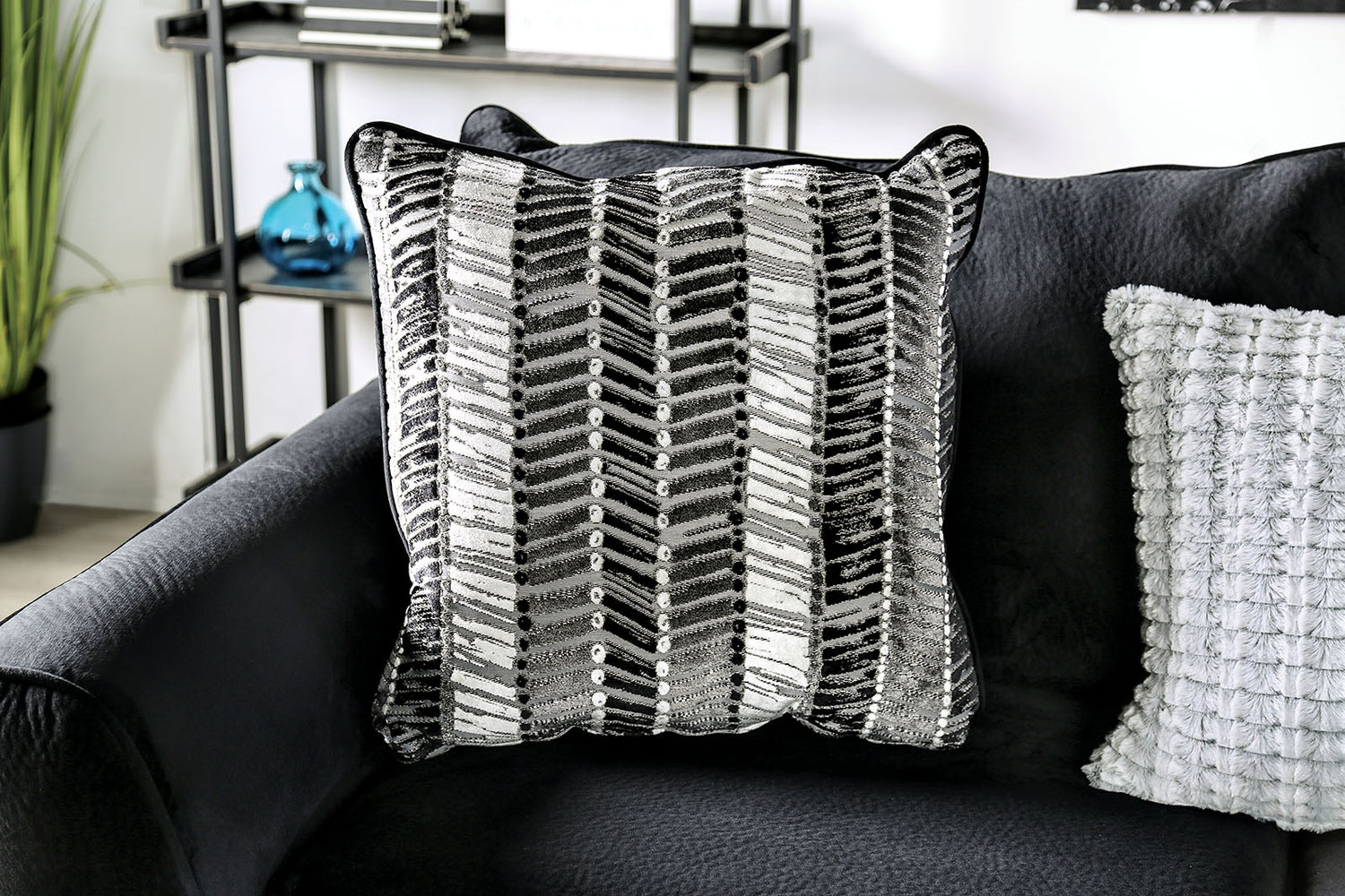 The abstract style can make any room special with such visual delights as rounded inner-edge arms, a discreet chaise, a U-shaped accent chair with arched armrests and a contrasting design ottoman that corresponds to loose pillows for a unifying theme. Microfiber faux crush velvet fabric and plush padding offer the 'sink right in' experience.