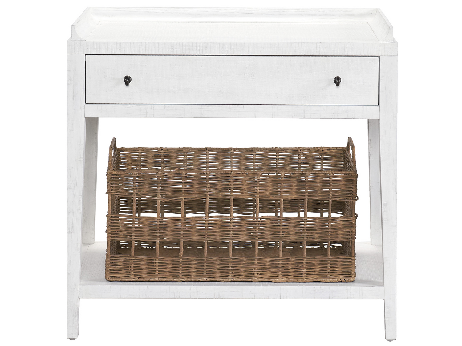 - Finish Details: Distressed finish with visible grain and texture; features two small, round, black drawer pulls.