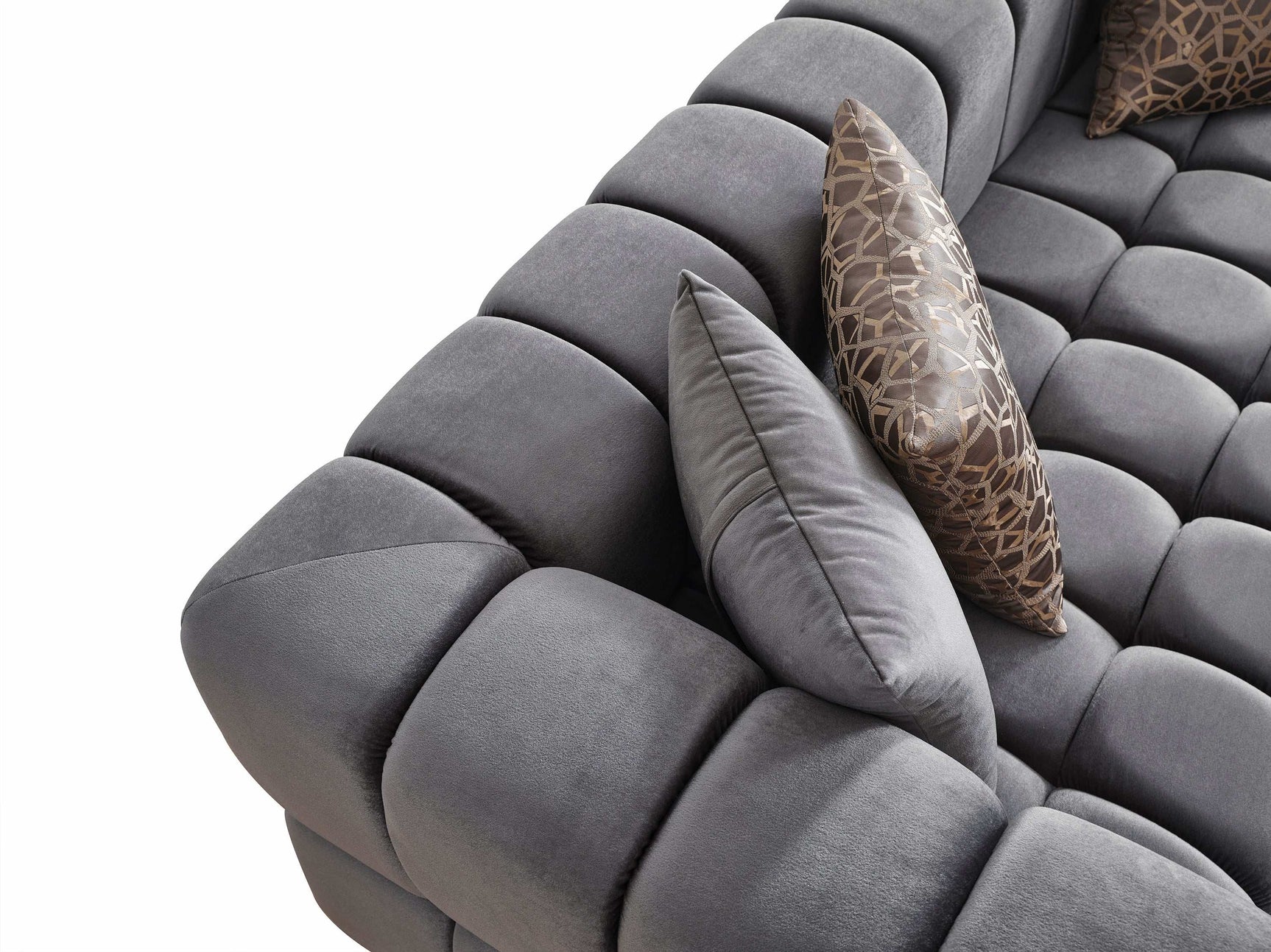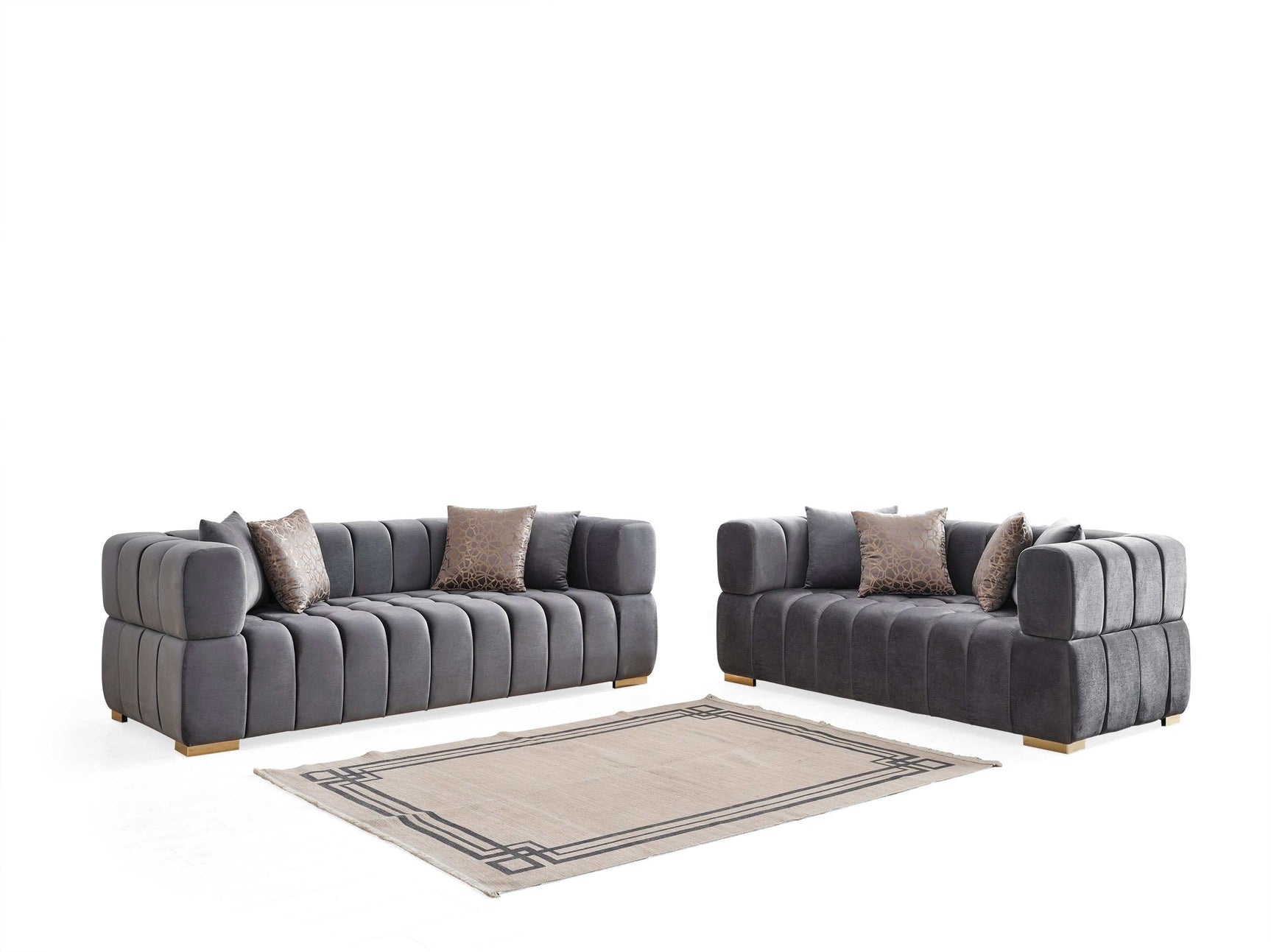 Elegant and eye-catching, defines the stunning Monica Living Room set. Its luxurious and glamorous look is the perfect addition to any space. Sofa and Loveseat boast a fusion of contemporary and classic styles. This astounding living room set epitomizes luxurious living and features lots of room to get comfortable. Gold short decorative legs of the set add glamorous style to your living room, while the included decorative 8 designer pillows give a homey slant to an otherwise uber-contemporary set.